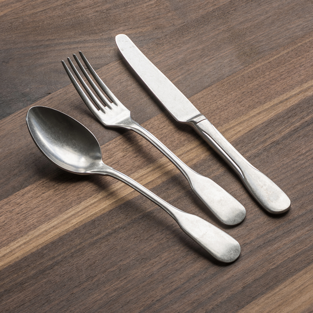 Mit klassischen Formen und einer seidig schimmernden, patinierten Oberfläche wirkt dieses Besteck, als hätte man es seit Jahrzehnten mit Freude im täglichen Gebrauch – oder soeben als echten Flohmarktschatz aufgestöbert. Tatsächlich handelt es sich jedoch um fabrikneue Ware in erstklassiger Ausführung von einem auf anspruchsvolles Küchenmaterial spezialisierten Unternehmen in der Lombardei. Der besondere Effekt entsteht durch Waschung mit feinen Porzellankieseln, die im harten Metall ein feines, unregelmäßiges Muster hinterlassen – stone washed. Rostfreier Edelstahl 18/10, Messerklingen aus rostfreiem Edelstahl 18/0. Spülmaschinenfest.