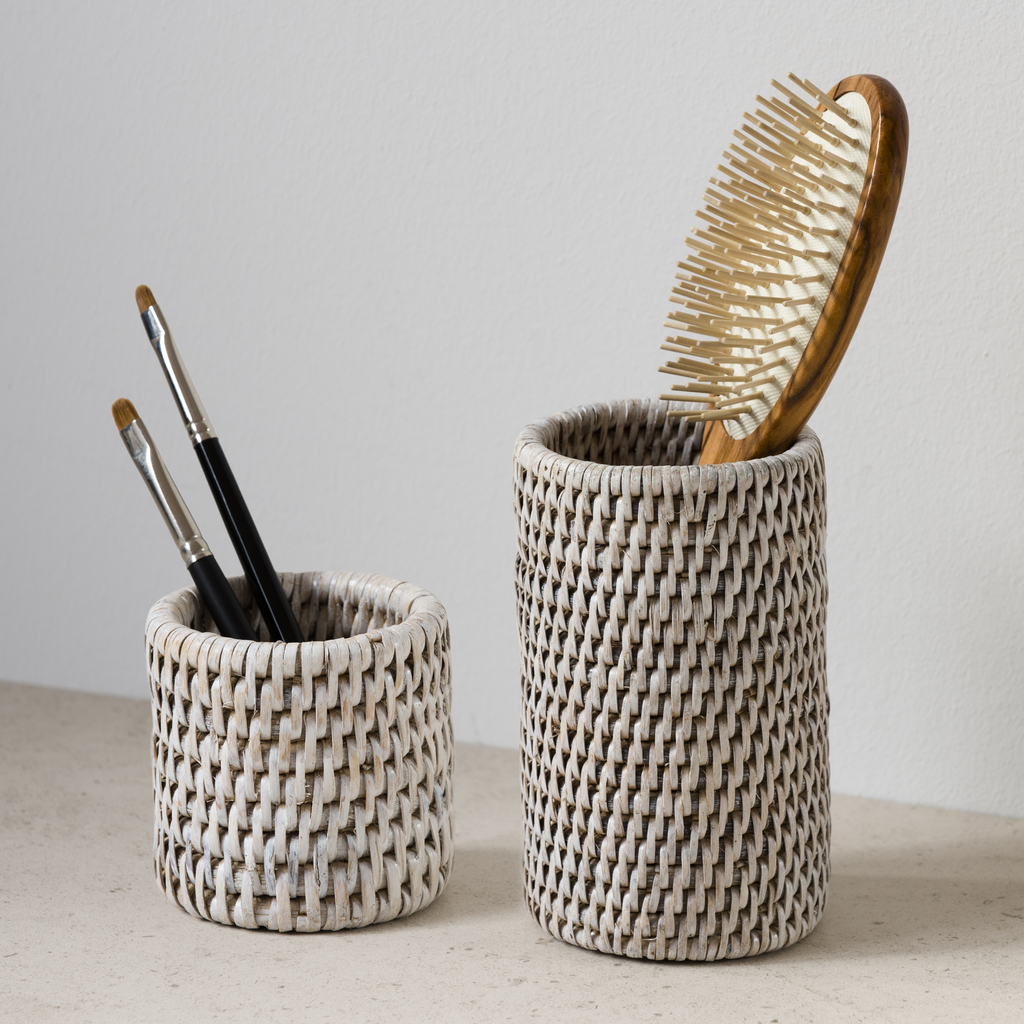 Ein großer und ein kleiner Utensilienköcher für das Badezimmer aus Rattangeflecht aus Birma. Die Rattanflechter Birmas haben die die wahrscheinlich längste Tradition und größte Erfahrung in diesem arbeitsintensiven Handwerk. Je enger und fester die Fasern geflochten werden, desto formstabiler ist das fertige Produkt, ohne dabei die für Rattan typische Flexibilität zu verlieren. Alle Rattanprodukte aus dieser Serie sind von Hand geflochten und mit einer wasserabweisenden Lasur versehen, die sie gegen die hohe Luftfeuchtigkeit in Badezimmern immun machen.