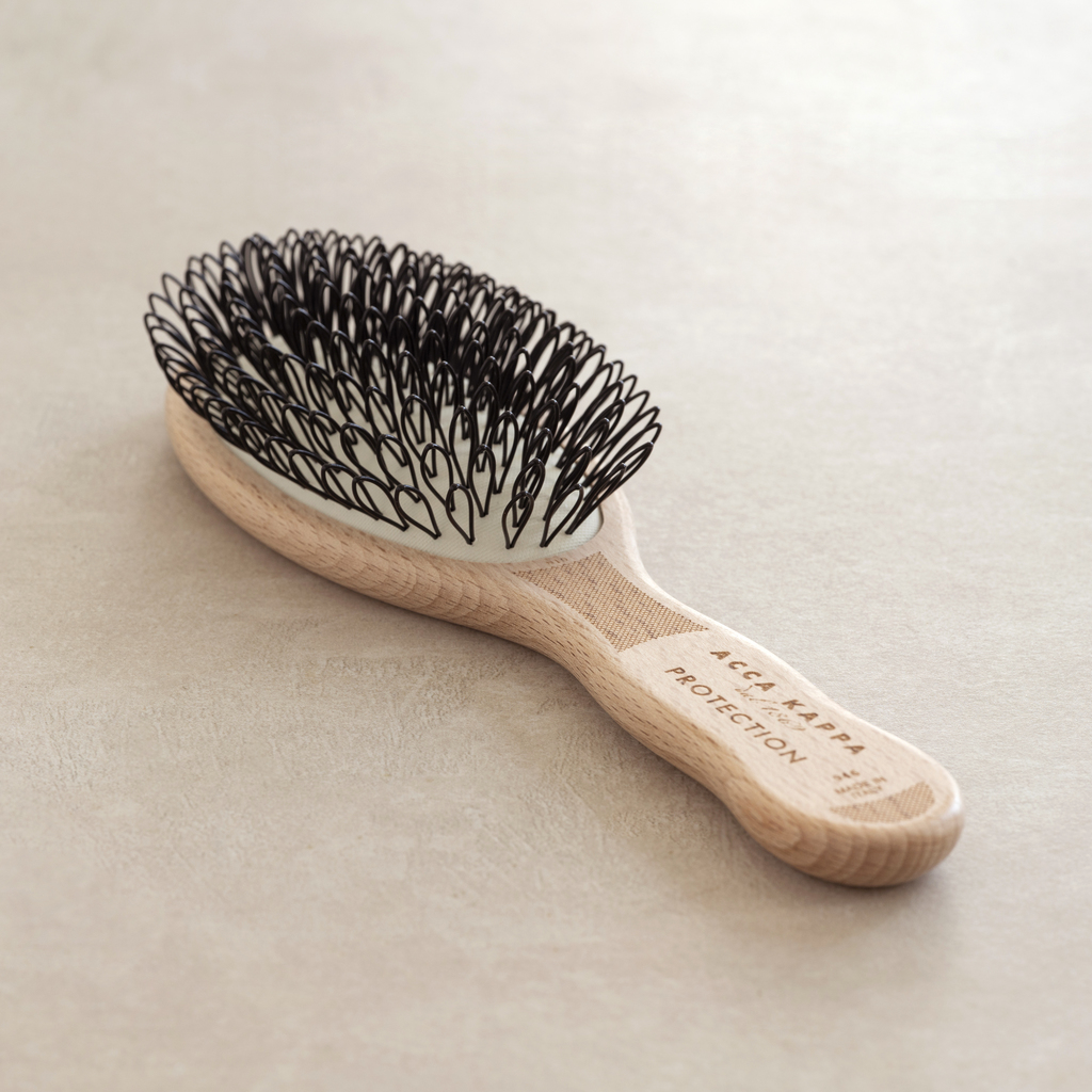 Diese Bürsten sind speziell auf feines und dünnes Haar abgestimmt: Anstelle von Borsten oder Drahtstiften sind sie mit flexiblen Polyamidschlaufen bestückt, die leicht durch dünnes Haar gleiten, Knötchen sanft entwirren und gleichzeitig die Mikrozirkulation der Kopfhaut stimulieren, die bei dünnerem Haar stärker dem Einfluss von Sonne und Wind ausgesetzt ist. Die Bürsten stammen von Acca Kappa in Treviso: Das 1869 vom deutschen Kaufmann Hermann Krüll gegründete Unternehmen machte sich rasch einen Namen mit dem Vertrieb erstklassiger Haarbürsten und gehört heute zu den feinsten Anbietern klassischer Pflegeprodukte. Seinen Namen verdankt es ganz einfach der italienischen Aussprache der Initialen des Gründers: Acca und Kappa.
