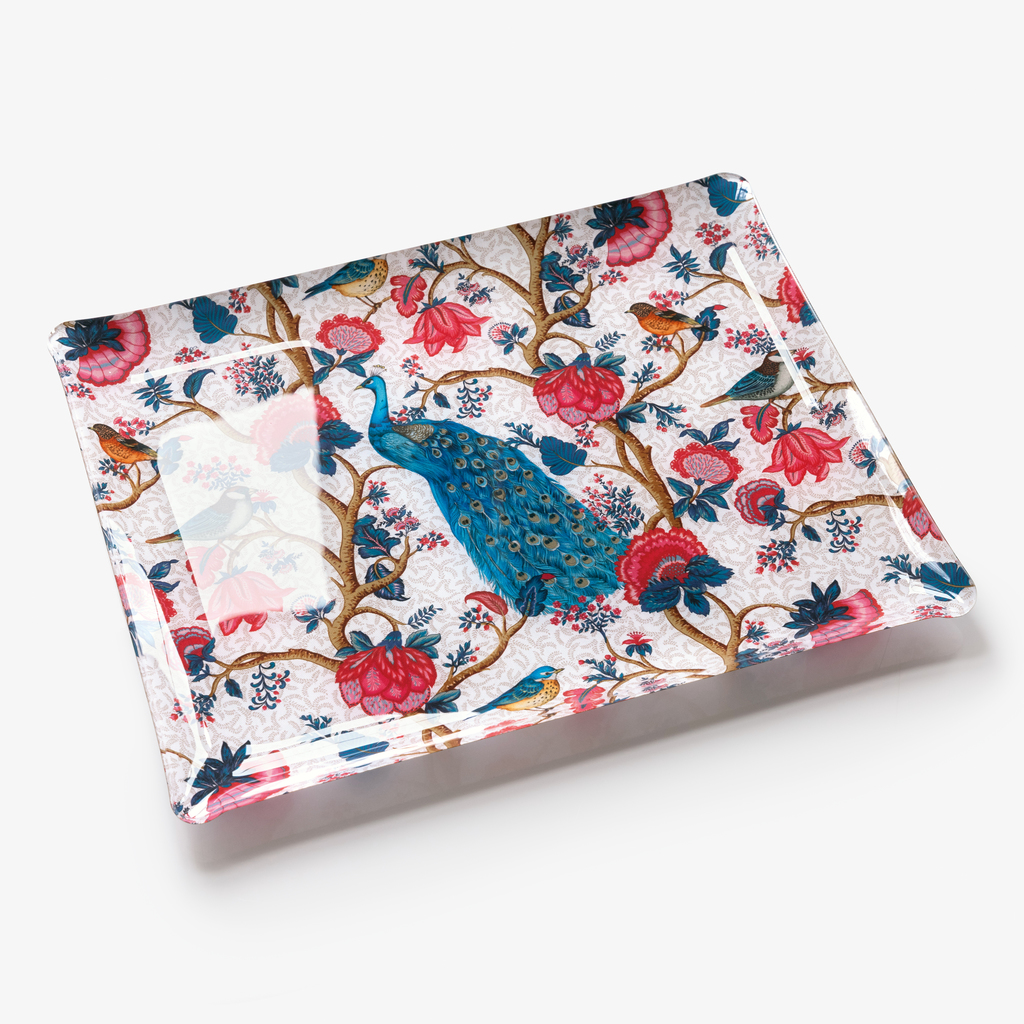 Ein dekorativer Blickfang auf dem Tisch oder dem Sideboard – dieses Tablett mit Pfauenmotiv fängt das Licht ein und lässt die Farben je nach Einfall changieren. Das farbenprächtige Bild auf Stoff ist zwischen zwei hochwertigen Acryllagen eingefasst. Die besondere Dicke der oberen Lage von vier Millimetern verstärkt die Leuchtkraft der Farben. Dank der reduzierten unteren Lage von einem Millimeter behält das Tablett seine Leichtigkeit. Es verfügt über umlaufend aufgebogene Ränder sowie vier kleine Silikonfüße. Zur Reinigung einfach feucht abwischen, nicht spülmaschinengeeignet.