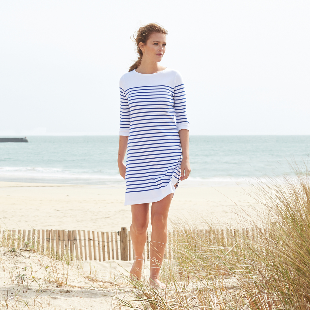 Sportlich-elegantes, sehr maritimes Kleid im typisch bretonischen Muster mit blauen Streifen auf weißem Grund aus reiner Baumwolle. Verarbeitet wird ein relativ dickes, stabiles Gewebe im Interlock-Strick, wie man es auch von bretonischen Fischerhemden kennt: Es flattert nicht, knittert nicht, behält jederzeit seine Form und bietet dennoch höchstmöglichen Komfort und Bewegungsspielraum. Es fühlt sich daher besonders in Wassernähe wohl, passt aber auch sehr gut zu eher landeinwärts angelegten Aktivitäten und ist ein perfektes Sommerbasic für einen französisch- maritimen Look.