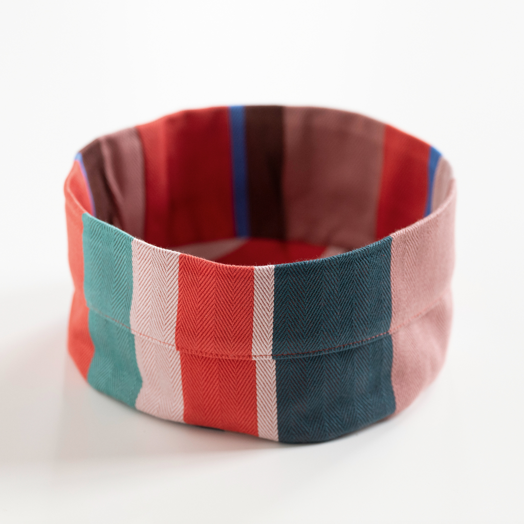 Der Brotkorb aus reiner Baumwolle in baskisch inspiriertem Streifenmuster bringt sommerliches Flair auf den Ess- oder Gartentisch. Die fröhlich bunte Farbpalette baskischer Dessins zeigt sich hier in leicht abgetönten Nuancen ein wenig dezenter und eleganter, aber nicht minder wohlgelaunt. Früher symbolisierten die Streifen die sieben Provinzen des Baskenlandes, Breite und Farbe der Streifen verrieten aber auch etwas über den Reichtum der Familie und den Beruf des Besitzers. Durch die spezielle Art des Webens im Fischgrätmuster entsteht nicht nur ein äußerst robuster Stoff, sein feines Zickzackmuster sorgt auch für eine edle und lebendige Optik. Gefertigt wird der Brotkorb bei Artiga, einem Textilwarenhersteller im äußersten Südwesten Frankreichs, der die lange Textiltradition des Baskenlandes Ende der 1990er Jahre mit umweltbewussten Ansätzen hat wieder aufleben lassen: Der gesamte Produktionsprozess – vom Spinnen und Färben des Garns bis zum Weben und Nähen der Stoffe – findet in Südwestfrankreich statt. Verarbeitet werden nur natürliche, biologisch angebaute Rohmaterialien aus dem eigenen Land.