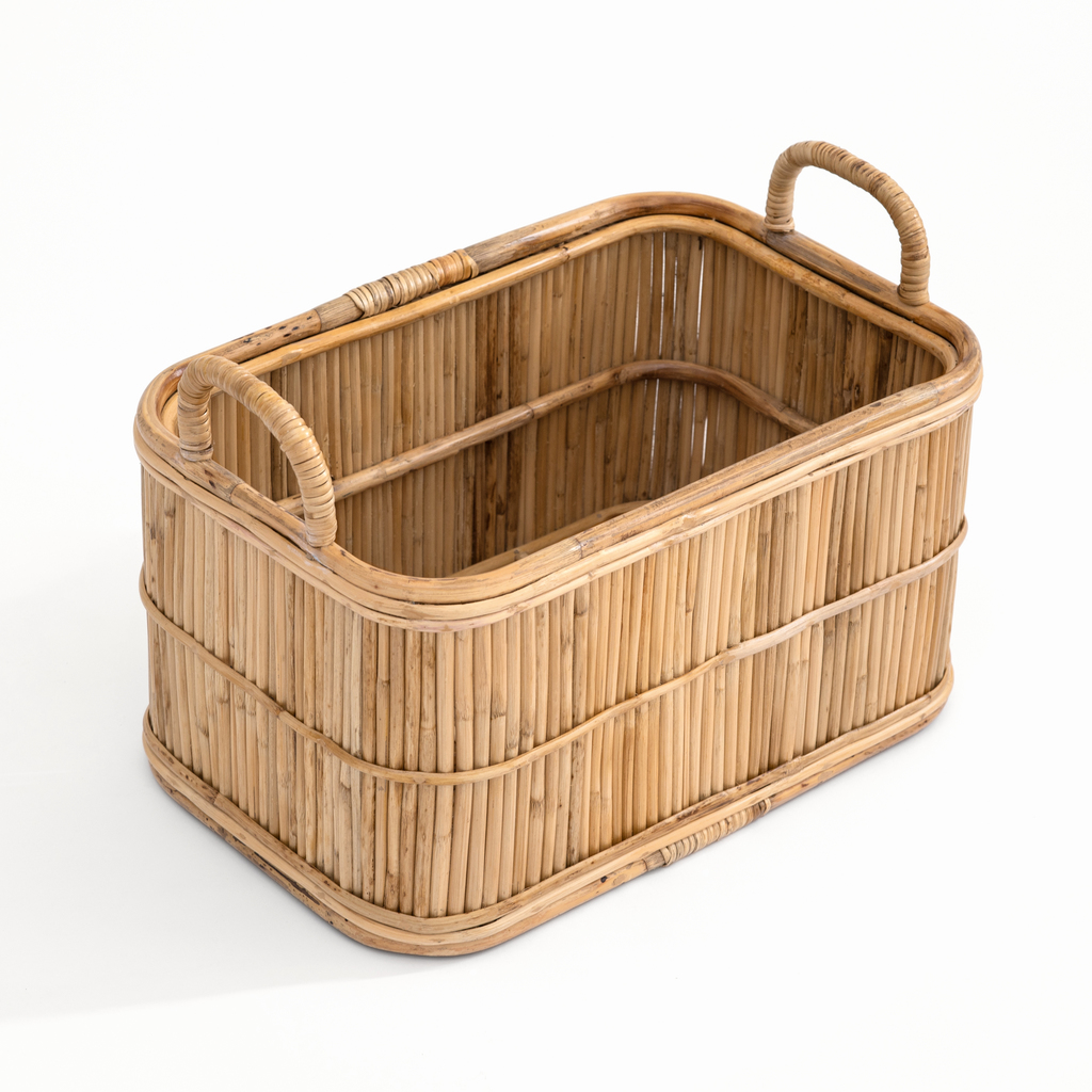 Leichter und stabiler Korb aus Rattan zum Aufbewahren von Kissen und Decken oder Zeitschriften. Die angesetzten Griffe sind mit Peddigrohr umwickelt. Länge 52 cm, Breite 34 cm, Höhe 28,5/36 cm.