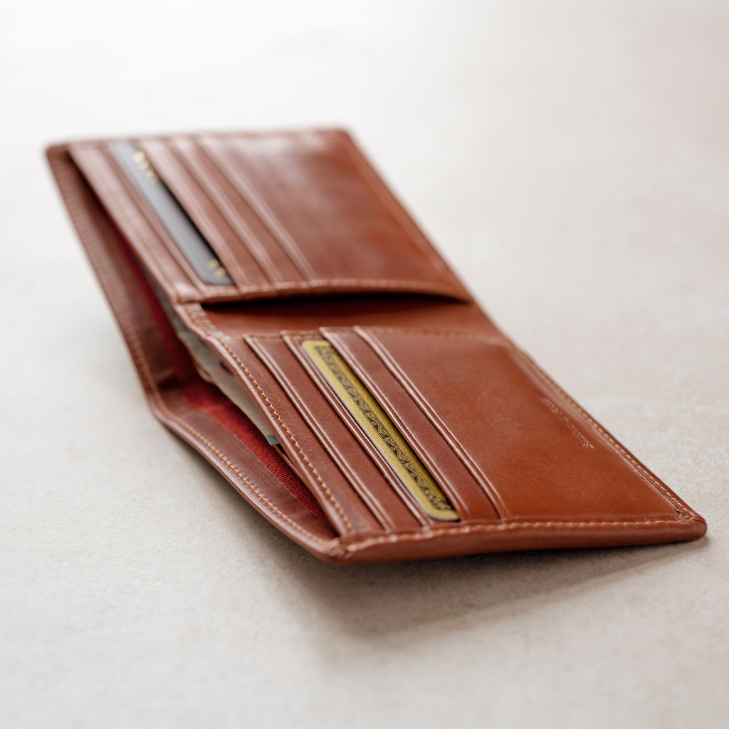 Handwerklich tadellos ausgeführte, klassisch aufgebaute Portemonnaies aus pflanzlich gegerbtem Sattelleder. Dabei handelt es sich um feines Rindsleder aus Italien, das in einer Gerberei in der Toskana auf traditionelle Weise gegerbt wird und sich durch einen angenehmen, leicht wachsigen und sehr natürlichen Griff auszeichnet. Es ist nicht vergleichbar mit Leder, das nur der Optik wegen mit Farbe und Deckmitteln behandelt wird, sondern besticht durch seinen natürlichen Charakter. Mit zunehmendem Gebrauch entwickelt das anfangs ein wenig steif wirkende Leder herausragende Flexibilität und herrliche Patina mit unterschiedlichen, nachdunkelnden Farbschattierungen, die auf künstlichem Wege niemals herzustellen wären. Das bordeauxrote Innenfutter besteht aus reiner Baumwolle. Zwei lange Banknotenfächer und vier Kartenfächer mit dahinterliegendem Steckfach auf der linken Innenseite. Rechts entweder vier weitere Kartenfächer oder ein Münzfach mit Druckknopf, jeweils mit dahinterliegendem Steckfach. Lieferbar in Schwarz oder Sattelbraun.