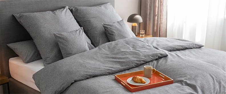 Bettwäsche aus Baumwollflanell fühlt sich mit ihrer weichen, angerauten Oberfläche herrlich warm an – angenehmer geht es kaum, wenn es draußen kalt und ungemütlich wird. Durch das Aufrauen wärmt das Gewebe nicht nur besser, sondern kann auch mehr Feuchtigkeit aufnehmen und gleicht die Temperatur besser aus. Der Flanell für unsere Bettwäsche wird aus feinem, weichem Baumwollgarn zu einem besonders dichten Gewebe verarbeitet, das angenehm leicht und anschmiegsam ist. Seine lebendige grau melierte Oberfläche erhält das Material durch das Verweben von schwarzen sowie weißen Kett- und Schussfäden.