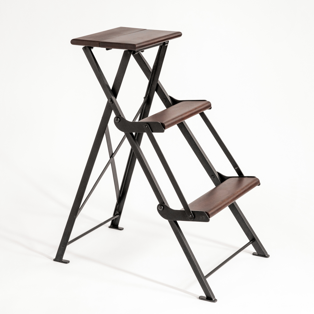 An der Bücherwand oder dem Büroregal aufgestellt, gibt einem dieser Klapptritt bis zu 74 cm mehr Körpergröße, um den Goethe oder einen Aktenordner aus den oberen Böden zu erreichen. Das Klappgestell aus flachen Stahlprofilen wird im Handumdrehen zu einem stabilen Tritt mit zwei schmalen Stufen und einer doppelt so tiefen Standfläche. Die Trittflächen bestehen aus lackiertem Akazienholz.