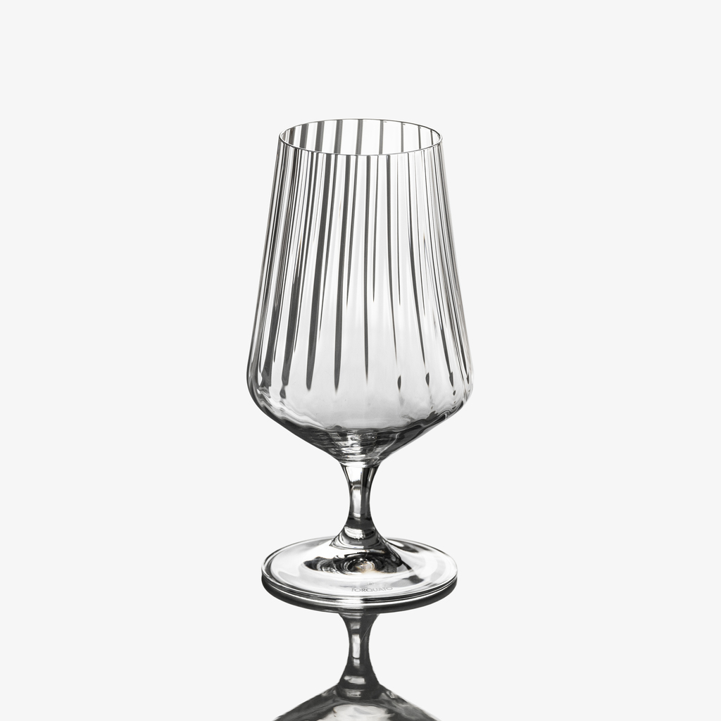Die feine, plissierte Struktur, die an die eleganten Stofffalten der Haute Couture erinnert, verleiht dieser Gläserserie ihre besondere optische Raffinesse. Die vertikalen Linien geben den Gläsern nicht nur eine angenehme Haptik, sondern auch eine zurückhaltende Eleganz. Die Serie ermöglicht es, den Tisch – vom Wasser bis zum Cocktail – in einem einheitlichen und zugleich ausdrucksstarken Stil einzudecken.