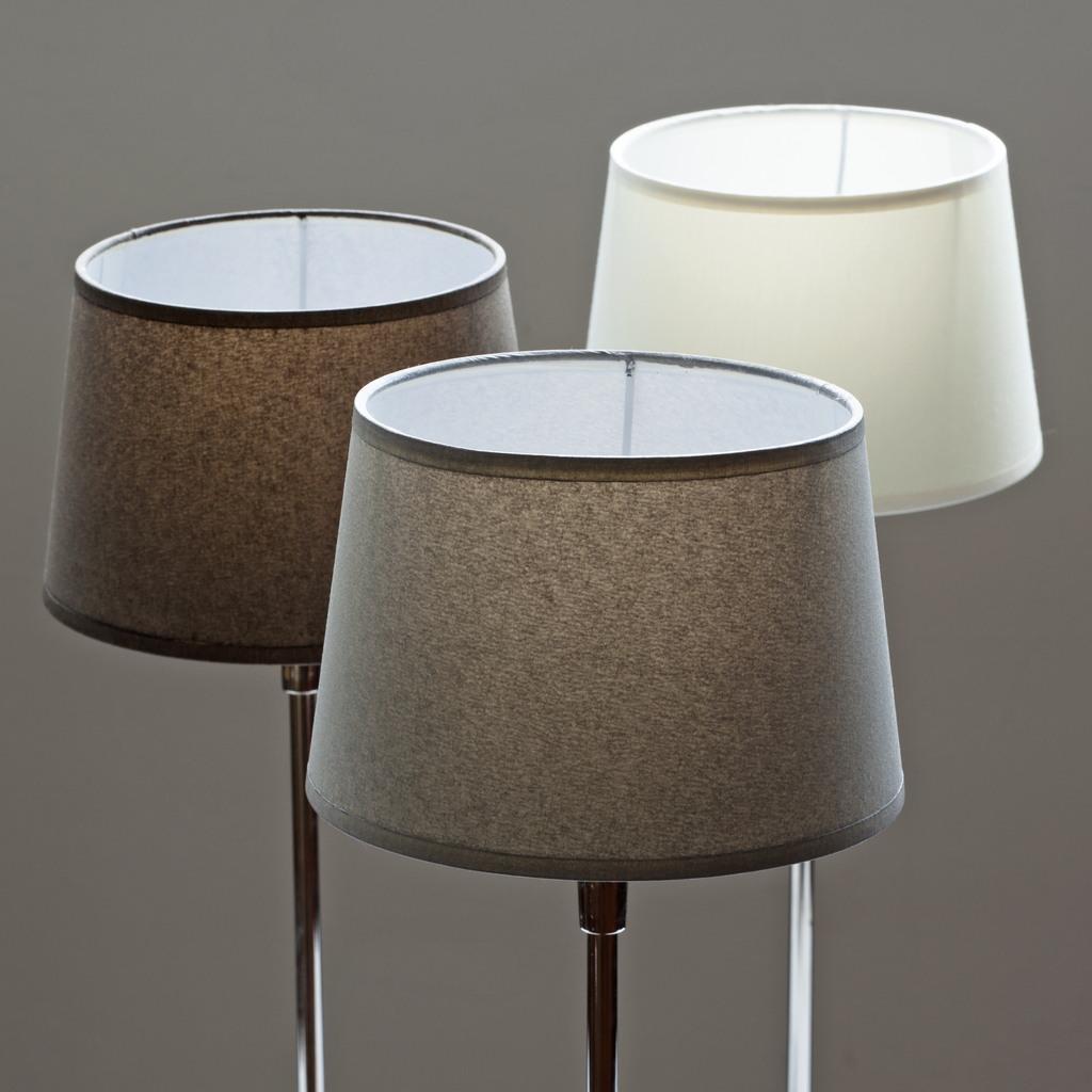 Runde, fast zylindrische Schirme zur Verwendung auf unseren Lampenfüßen und Wandhalterungen von Casadisagne. Die Schirme sind aus verlöteten Metallgestellen mit einem Bezug aus sehr durablem Stoff, innen mit einem Reflektor aus Kunststoff bezogen. Schirme in den Größen S und M für Glühbirnen E 14, in Größe L für E 27.