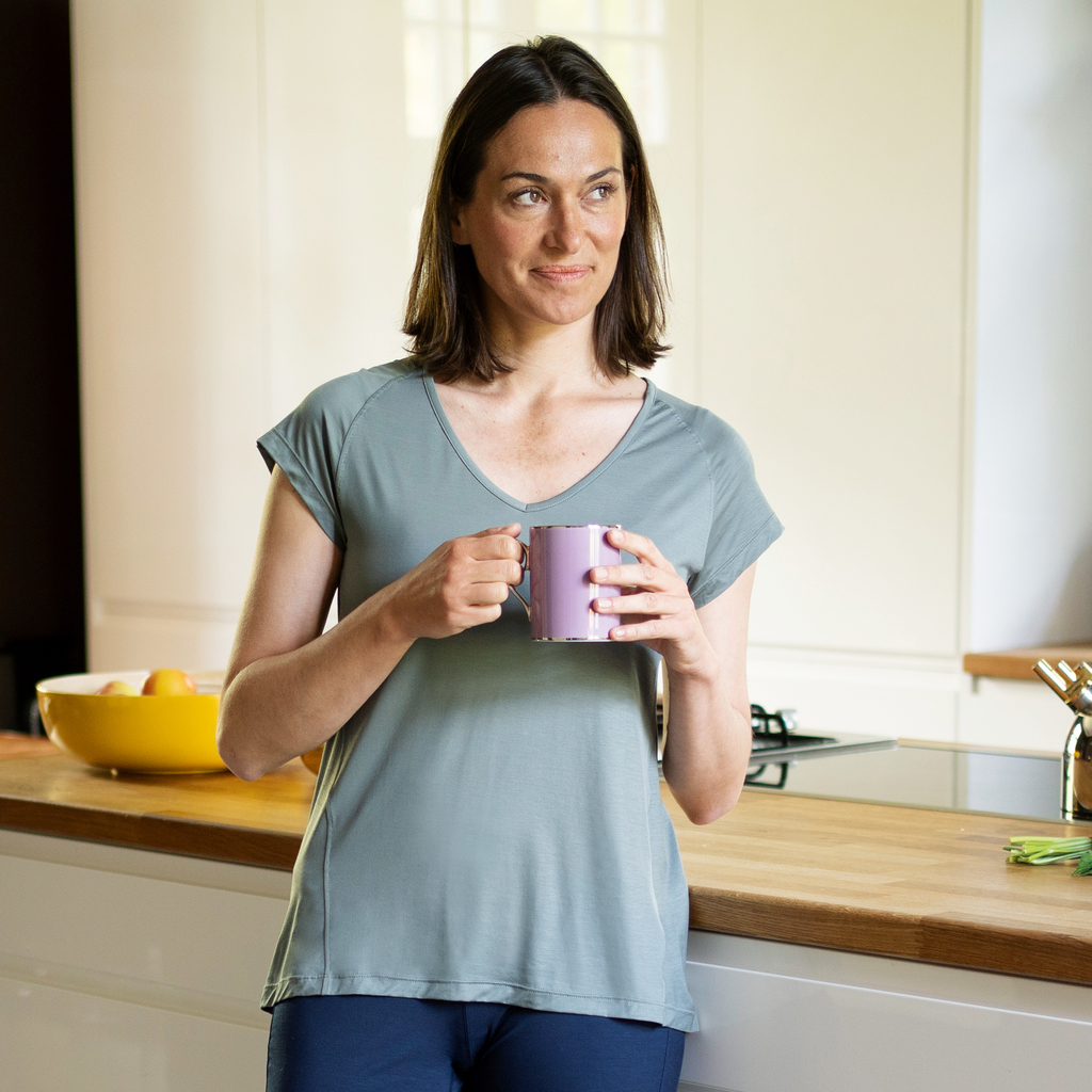 Schlaf-T-Shirt mit V-Ausschnitt und Raglanärmeln aus 92% Lyocell und 8% Elasthan mit aktiver Kühlwirkung – insbesondere bei hohen Temperaturen ein entscheidender Faktor für entspannten Schlaf. Sehr flach ausgeführte, leicht nach vorne versetzte Seitennähte. Nicht im Trockner trocknen, nicht chemisch reinigen, nicht bleichen.
