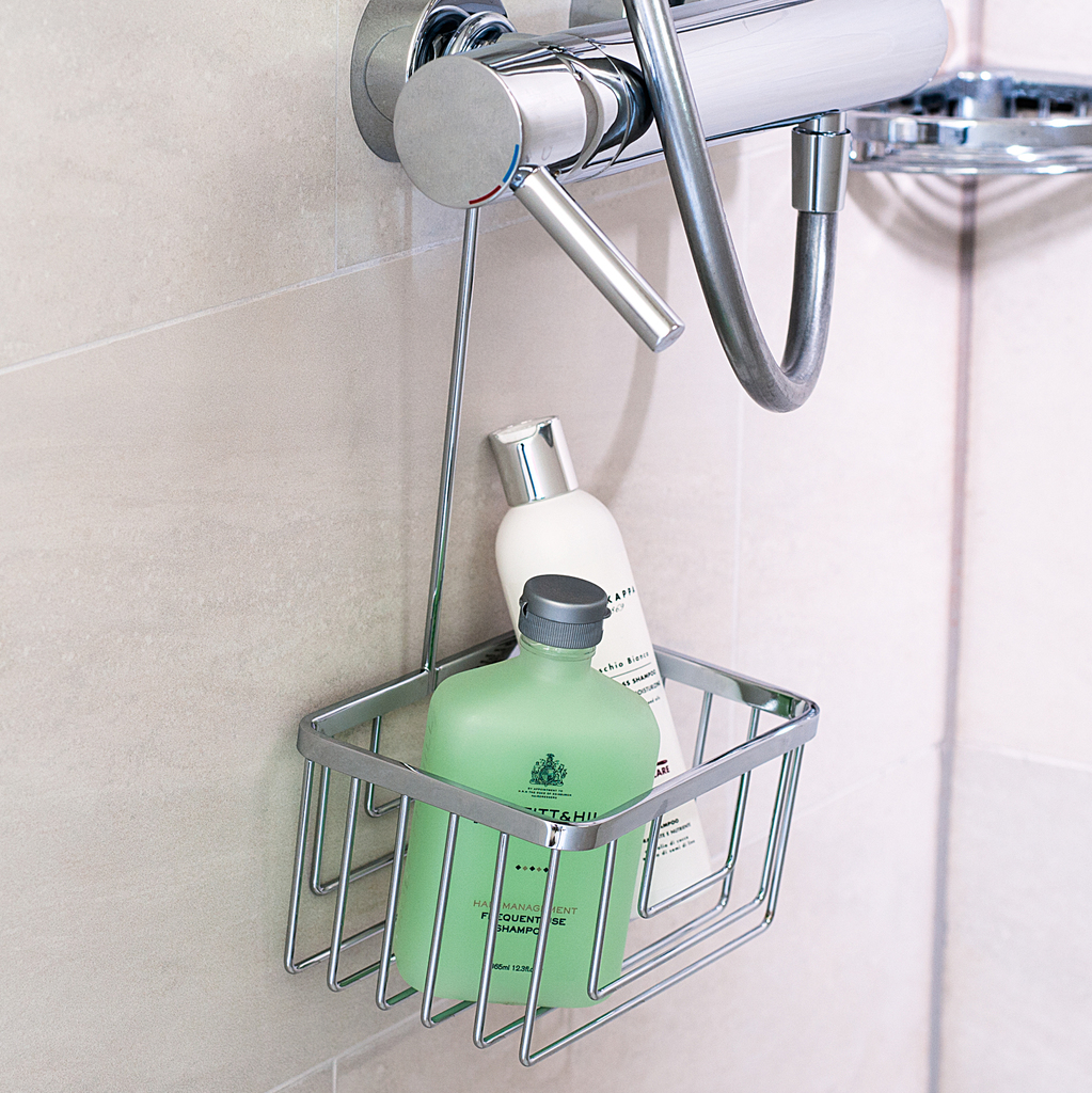 Eine befriedigende Lösung, falls man in der Dusche keinen Wandkorb anbringen möchte oder kann: Dieser Korb wird mit einem Bügel an der Wandbefestigung der Brausestange oder der Mischbatterie eingehängt und kann jederzeit wieder abgenommen werden, falls man ihn reinigen möchte oder umzieht.