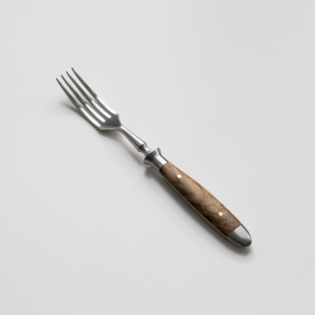 Grundlage für jedes einzelne Teil ist ein Stück rostfreien Chrom- Vanadium-Stahls, das von Hand geschmiedet und anschließend ebenfalls in mühevoller Handarbeit durch Schleifen und Polieren zur Perfektion gebracht wird. Auch von Hand werden die bauchigen Griffschalen aus Holz zugerichtet, die anschließend mit zwei wiederum von Hand gesetzten Messingnieten nahezu nahtlos mit der Verlängerung der Klinge verbunden werden. Die Gabelzinken sind einzeln rundgeschliffen und zugespitzt, um müheloses und schonendes Aufspießen zu ermöglichen, und für die Messerklingen kommt das Verfahren des Blaupließtens zur Anwendung: ausgiebiges Schleifen der Klinge bis zur feinstmöglichen Stufe, an dessen Ende eine extrem glatte Oberfläche mit bläulichem Schimmer entsteht. In der klassischen Ausführung sind die Griffschalen des Eichenlaub-Bestecks aus afrikanischem Ebenholz gefertigt: feinporig, dicht und von dunkler, nahezu schwarzer Farbe mit leichten, bräunlichen Streifen.