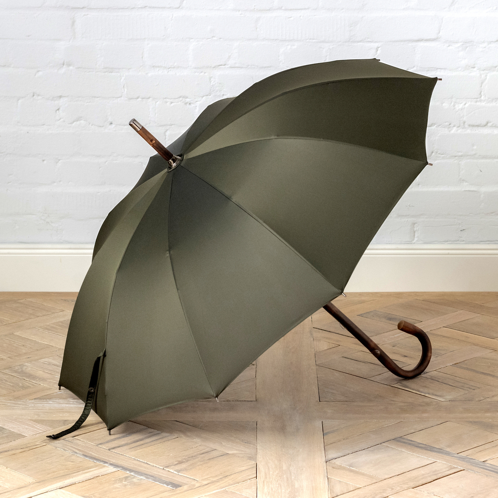 Klassischer, von Hand zu öffnender Regenschirm mit 10-teiliger Oxfordbespannung aus italienischem Nylongewebe mit einem durchgehenden, stützfähigen Stock. Optional erhältlich ist ein passendes 100 % Nylon-Futteral.
