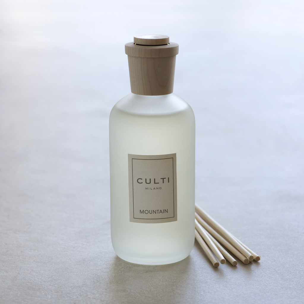 Satinierter Glasflacon à 250 ml Duftflüssigkeit mit einem Verschluss aus massivem Ahornholz, inklusive sieben Rattansticks. Diese feinen Raumdüfte stammen von Culti in der Lombardei, wo man 1990 entdeckt hatte, dass ein in Parfüm getauchtes Rattanbündel den Duft nicht schnell in der Luft verteilt, sondern langsam, dezent und sehr gleichmäßig.
