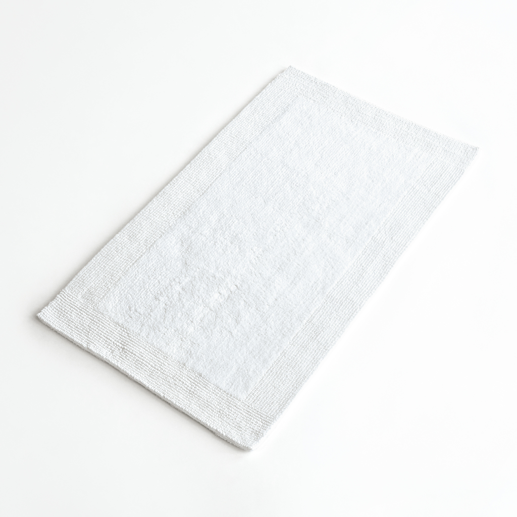Diese Badematten aus doppelfloriger Baumwolle sind ungewöhnlich üppig. Man steht warm und weich „in“ ihnen. Auf der einen Seite ist der Flor aus geschlossenen Schlaufen aufgeschnitten, auf der anderen – dicken – Seite bleiben die Schlaufen stehen. Die Matte hat eine Dicke von über 2cm, ein Gewicht von 2250g/m² und sie ist von beiden Seiten benutzbar.