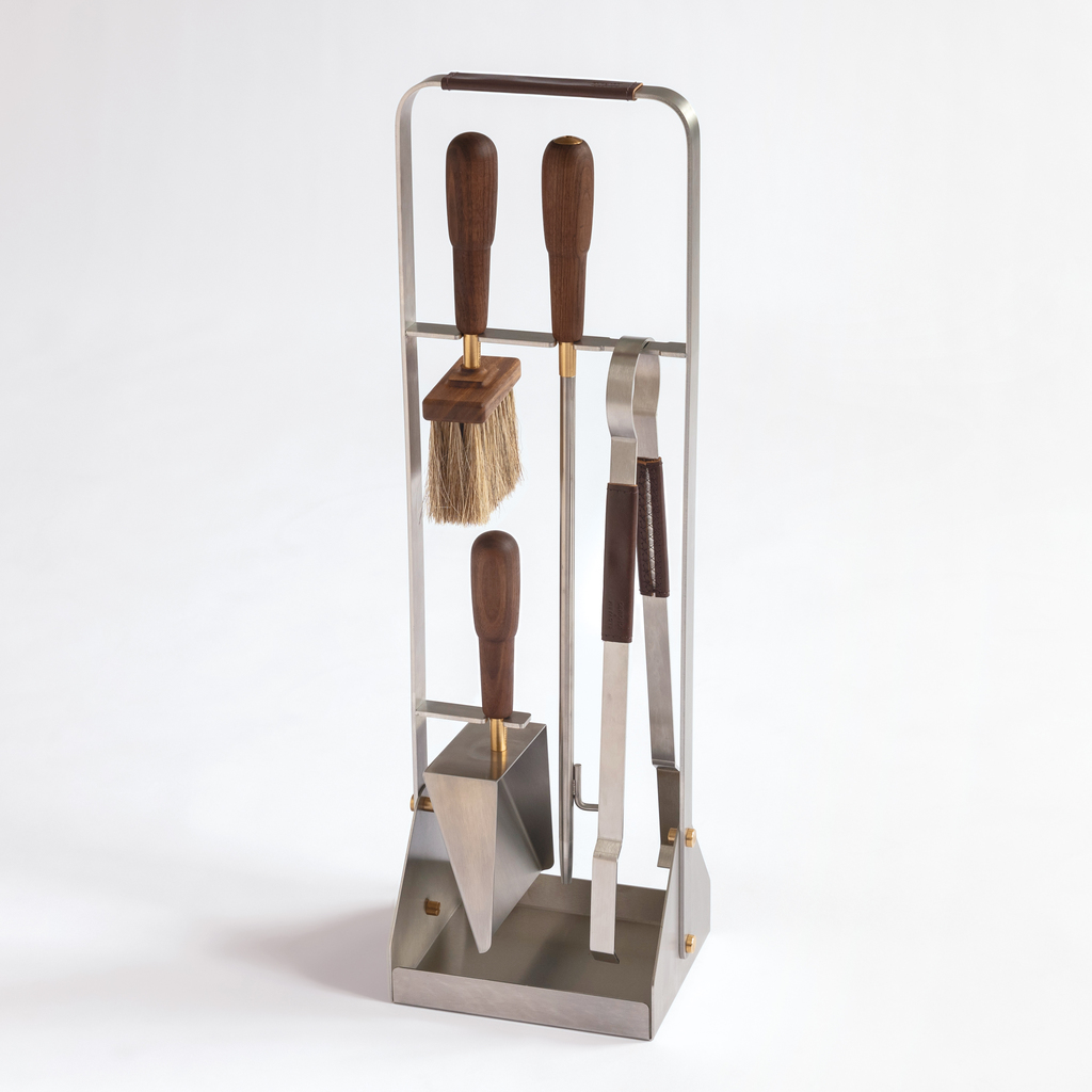 Vierteiliges Kaminbesteck mit Ständer aus pulverbeschichtetem Stahl oder Edelstahl: mit Schürhaken, Kohlenzange, Kehrblech und einer Aschenbürste mit Rosshaar- und Fibre-Besatz, einer Naturfaser aus der mexikanischen Agavepflanze. In den Schürhaken ist ein Kaminanpuster mit Messing-Mundstück integriert, sodass man Luft direkt und wohldosiert in die Glut pusten kann, ohne Asche aufzuwirbeln. Besatz (wo vorhanden) aus pflanzlich gegerbtem Leder. Griffe aus Walnuss- oder Birkenholz.
