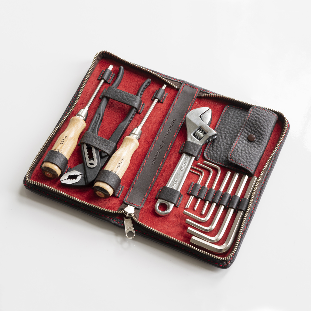 Enthalten sind ein Schlitz- und ein Kreuzschlitzschraubendreher mit Holzgriff, eine Rohrzange, ein stufenlos verstellbarer Schraubenschlüssel aus geschmiedetem Stahl sowie acht Innensechskantschlüssel. Eine kleine Innentasche mit Druckknopf dient der Aufnahme von Kleinteilen. Umlaufender Reißverschluss und rotes Wildlederfutter.