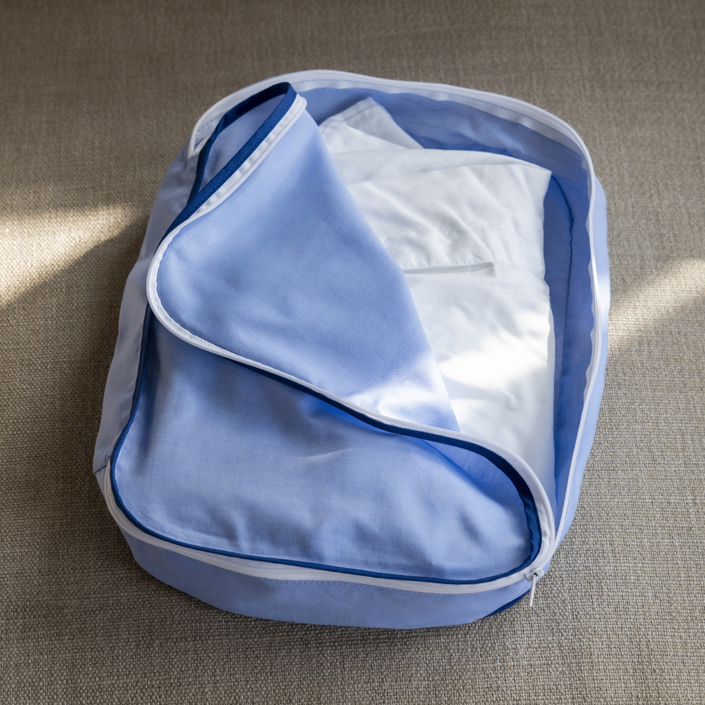 Mit ihren Maßen von 23 x 30 cm bietet sie die ideale Größe für kleinere Wäschestücke wie Strümpfe und Unterwäsche oder für feine Strick- und Seidenoberteile. Ebenso lässt sich ein einzelnes, kleiner gefaltetes Oberhemd darin unterbringen. Der breite Umschlag und das elegante Band zum Verschließen schützen den Inhalt zuverlässig und sorgen für Ordnung im Reisegepäck. 100 % Baumwolle.