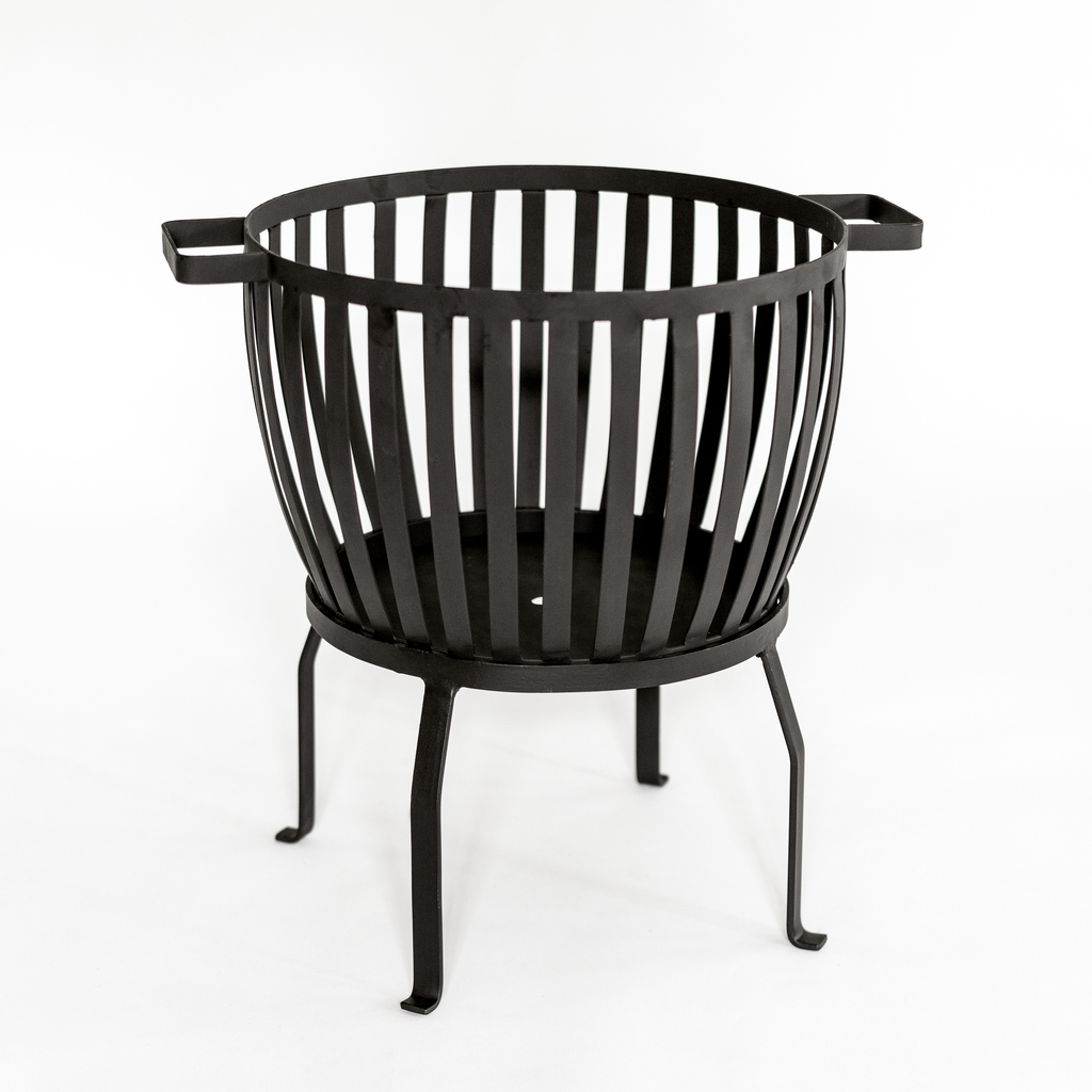 Offener Feuerkorb für ein gemütliches Lagerfeuer im Garten. Der Korb steht kippsicher auf vier Beinen und besteht aus verschweißten, schwarz beschichteten Eisenprofilen. Der dunkle Farbüberzug wird mit der Zeit verschwinden und sich in eine natürliche Rostschicht verwandeln. Mit zwei angeschweißten Griffen lässt sich der Feuerkorb abgekühlt einfach transportieren.