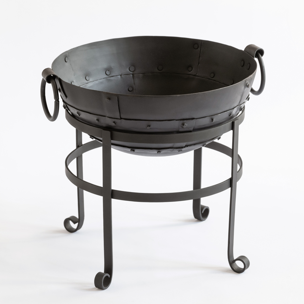 Kompakte Feuerschale für die Verwendung im Freien. Die eigentliche Schale ist aus Eisenplatten zusammengefügt und sitzt auf einem eisernen Untergestell. Der dunkle Farbüberzug wird mit der Zeit verschwinden und sich in eine natürliche Korrosion (Rost) verwandeln, was wesentlich zur Gestaltung der Schale beiträgt. Ein Loch am Boden der Schale dient als Ablauf für Regenwasser.