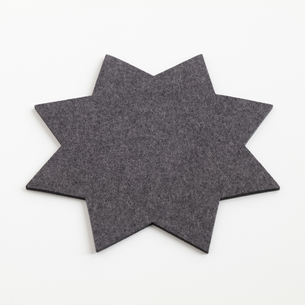 Diese sternförmigen Untersetzer aus reinem, sehr dichtem Wollfilz stammen von einem Betrieb am Niederrhein, der sich auf die Herstellung von Wollfilzprodukten aus reiner Schurwolle spezialisiert hat und diese in einer umfangreichen Farbpalette anbietet. Die Untersetzer isolieren gegen Hitze, saugen Feuchtigkeit auf und sorgen für kippelfreien Stand. Wählen Sie aus den Farben rot, grün und grau. 100 % Wolle.