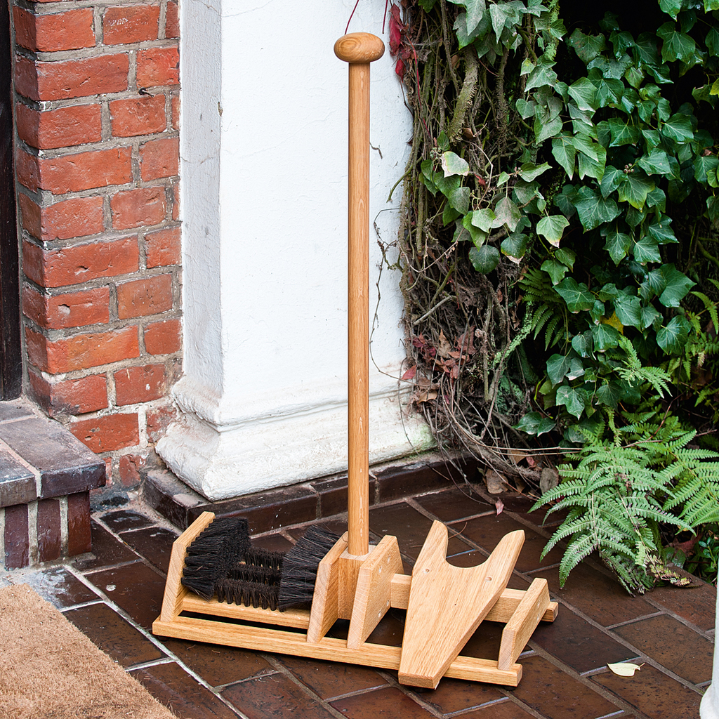 Dieser Schuh- und Stiefelreiniger aus massiver Eiche ist ein sowohl besonderes schöner als auch hilfreicher Gegenstand. Mittels fünf Bürsten, drei für die Unterseite der Sohle und jeweils eine für die Seiten kann man ohne Bücken seine Stiefel auch von groben Schmutz befreien. Anschließend kann man sich der Stiefel mit Hilfe des Stiefelknechtes entledigen. Am Ende des Stockes ein breiter Knauf zum Aufstützen. Da geöltes Eichenholz sehr wetterfest ist, ist der Abtreter auch für den Einsatz im Freien geeignet und findet ansonsten seinen Platz unter dem Vordach, in der Garderobe oder im Pferdestall.