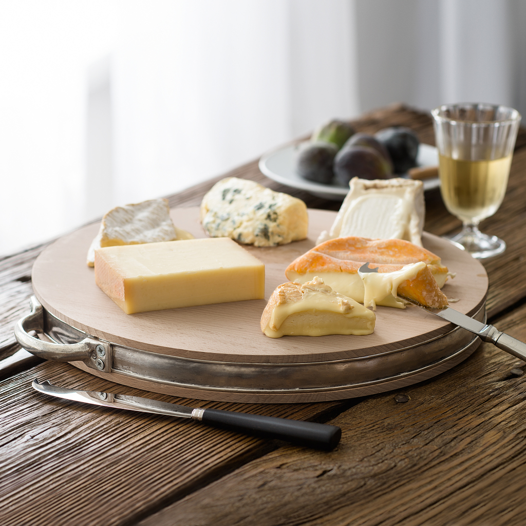 Dieses Schneid- und Servierbrett gehörte jahrelang zu unseren persönlichen Lieblingsprodukten. Es stammt von einem Zinnwarenhersteller in Brescia in der Lombardei, der seit 1973 Zinnwaren für Haus und Tafel in erstklassiger Qualität produziert und auch der Hersteller unseres Zinnbestecks ist. Nachdem das Brett seit einigen Jahren nicht lieferbar war, freuen wir uns besonders, es nun wieder anbieten zu können. Mit seinen 40 cm Durchmesser ist es ein wahrhaft großes Brett für Käse, Wurst und Schinken, Braten oder Brot. Die sorgfältig verleimten Bretter werden durch einen Zinnreifen zusätzlich fixiert. Die Griffe sind ebenfalls aus Zinn gegossen, aufwändig entgratet und poliert, so dass sie, wie bei Zinnwaren üblich, wie antikes Silber wirken.