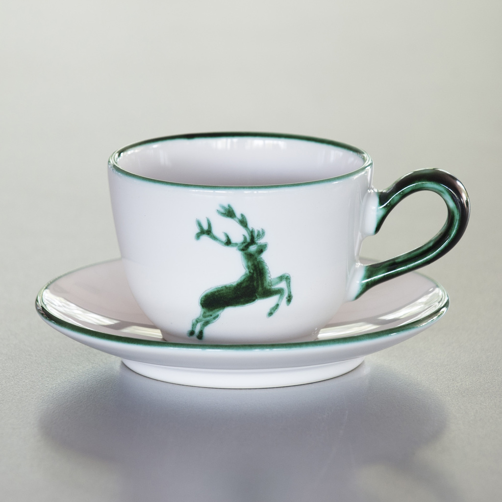 Das Dekor Grüner Hirsch gibt es seit Anfang der 1950er Jahre im Programm der Gmundner Keramik aus Gmunden am Traunsee im Salzkammergut ist ein ländlich-eleganter Klasssiker. Es wurde seinerzeit für das weltberühmte Hotel "Goldener Hirsch" in Salzburg kreiert und später aufgrund großer Nachfrage für den Handel freigegeben.