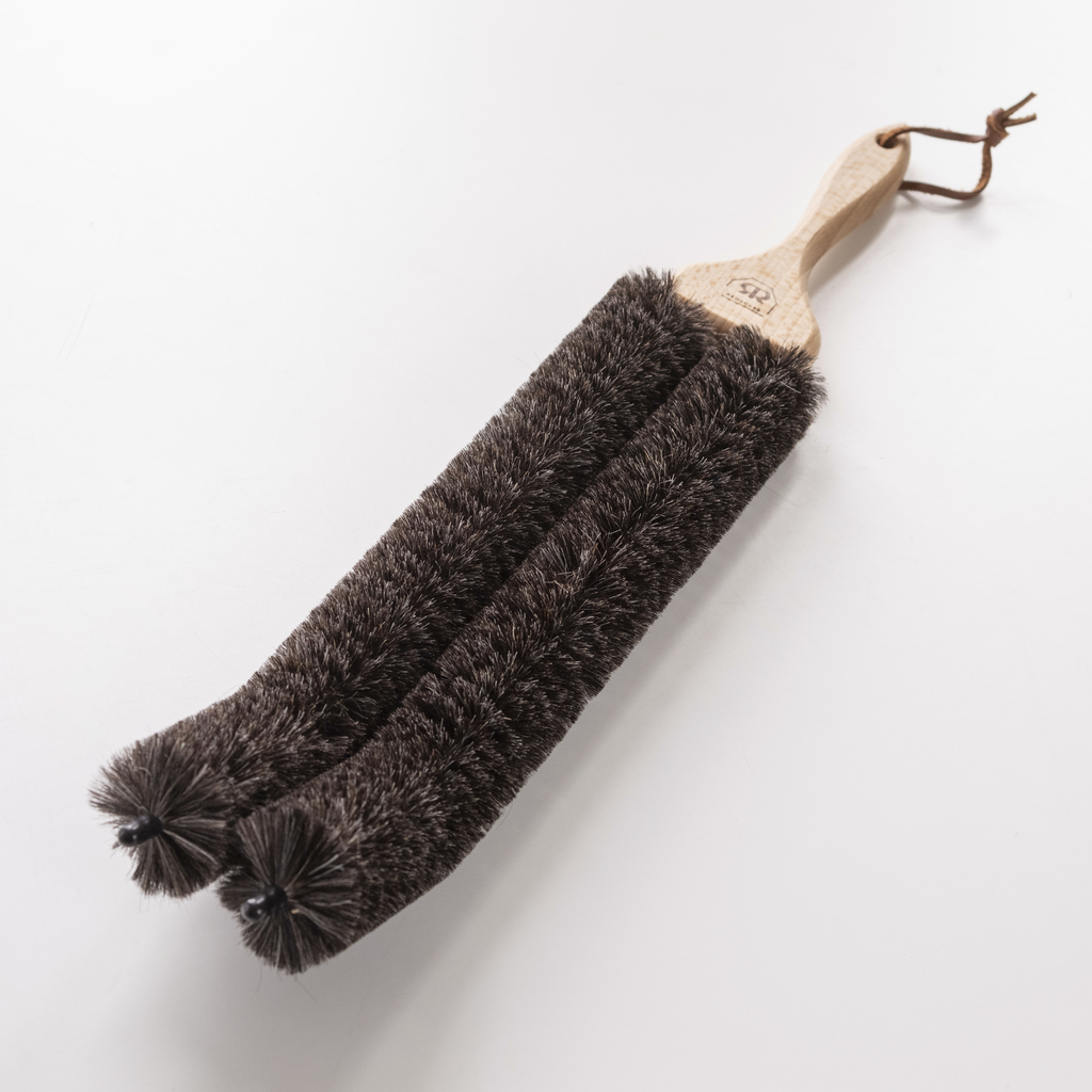 Die Bürste wurde speziell für Handtuchtrockner-Heizkörper konzipiert, ist ansonsten aber auch für herkömmliche Heizkörper geeignet. Die beiden mit weichem Ziegenhaar bestückten Bürsten (Ø 4,5 cm) sind lang genug, um nicht nur die einzelnen Heizelemente zu entstauben, sondern auch einen Teil der Wand dahinter. Die Bürsten können je nach Form der Heizung zurechtgebogen werden. Griff aus geöltem Buchenholz. Bürste 34 cm, Griff 16 cm.
