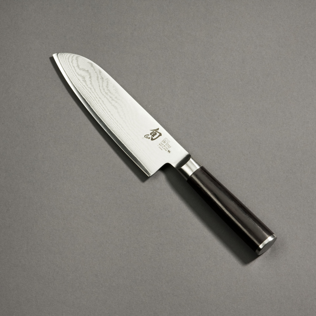 Das japanische Universal-Kochmesser. Santoku bedeutet Messer der drei Tugenden, was bedeutet, daß es gleichermaßen für Fisch, Fleisch und Gemüse geeignet ist.