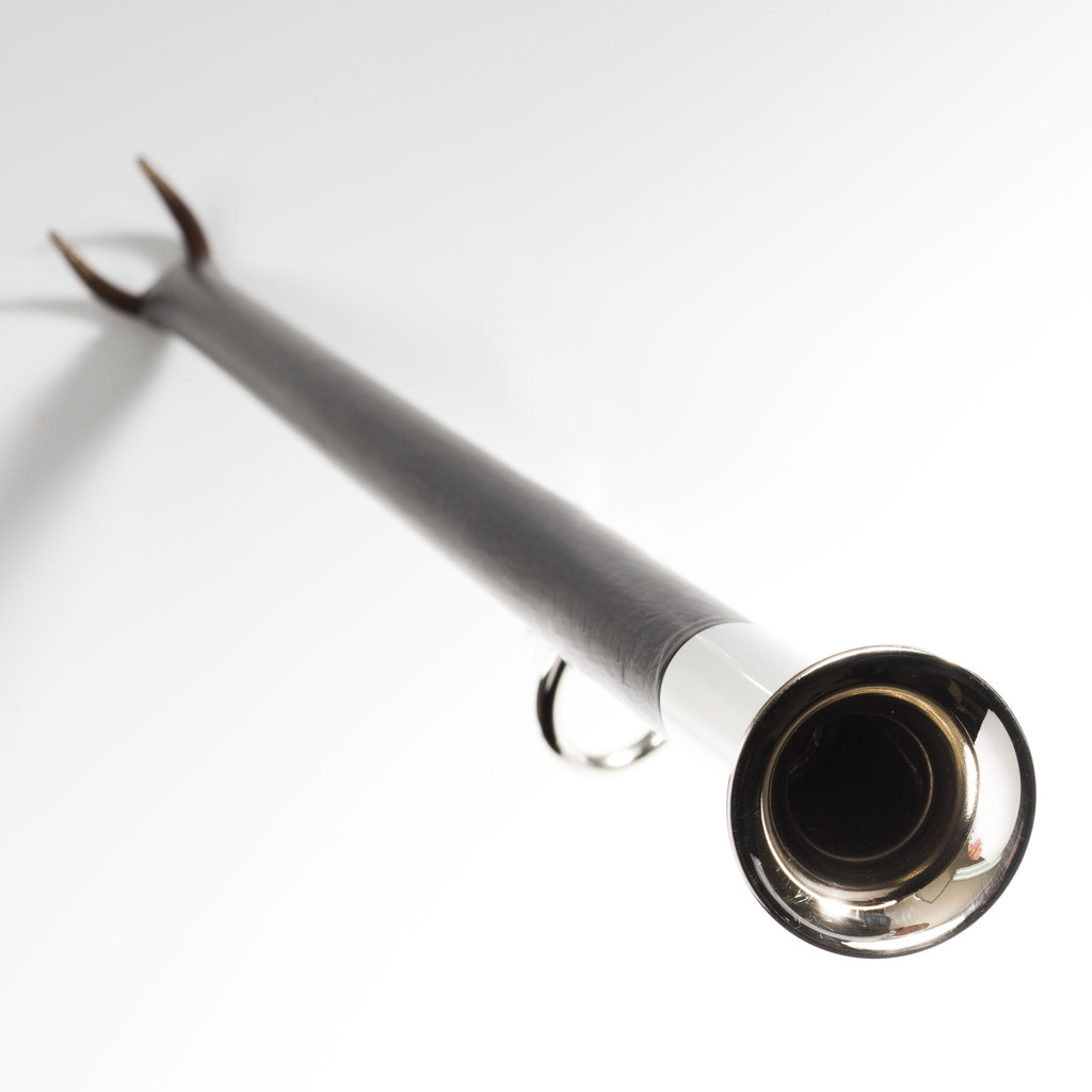 Alles, was man mit einem Feuer anstellen kann, geht mit diesem Gerät: Durch das Austrittsloch am Ende entsteht ein starker Luftstrom mit Sauerstoffzufuhr direkt an der Glut. Am eisernen Ende des Werkzeuges sitzt ein Schür-haken. Schwarzes Eisenrohr mit Mundstück und Aufhängring aus -unlackiertem -Messing bzw. Messing, das mit einer Auflage aus Neusilber versehen wurde. Aus einer kleinen niedersächsischen Metalldrückerei.
