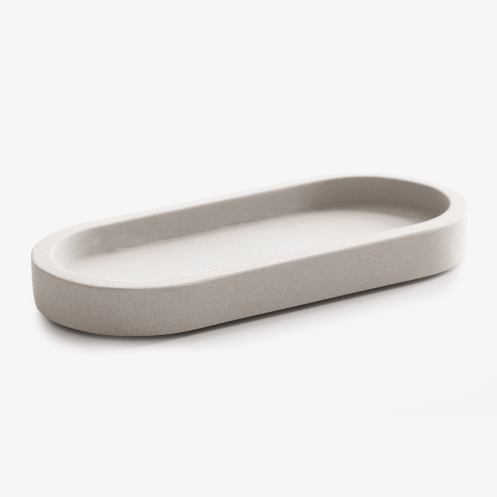 Jedes Stück dieser puristischen Badezimmerserie lassen wir aus massivem Sandstein fräsen, aus dem normalerweise Fliesen oder Fassadenelemente gefertigt werden. Der besondere Charme des Materials liegt in seiner leicht rauen, offenporigen Oberfläche, die sich angenehm anfasst und im Laufe der Zeit durch den Kontakt mit Wasser und Seife eine leichte Patina erhält. Da Sandstein ein Naturprodukt ist, kann jedes Stück in Färbung und Textur minimal von den anderen abweichen. Kunststofffüßchen am Boden sorgen dafür, dass empfindliche Keramik- oder Glasoberflächen im Bad nicht zerkratzt werden.