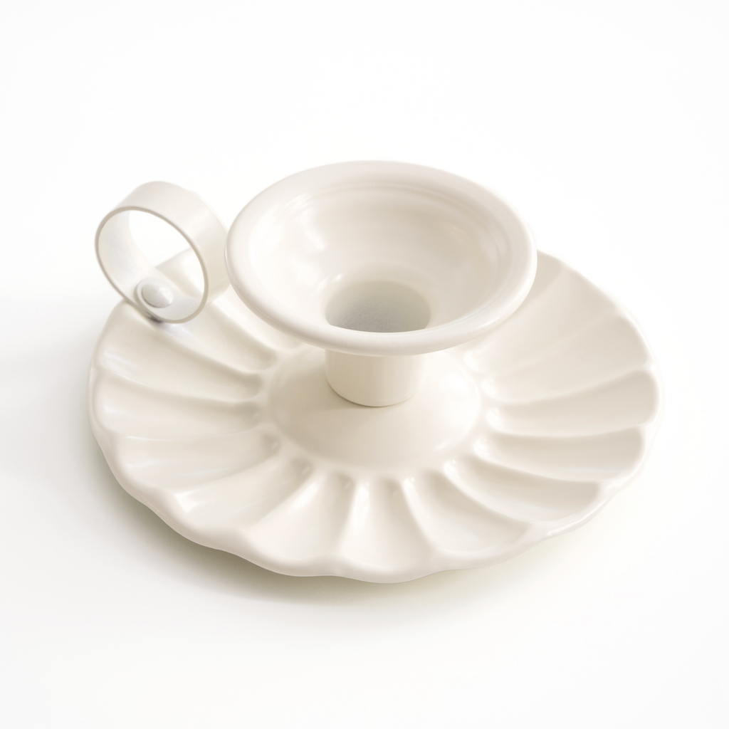 Dass er nur federleichte 16 Gramm wiegt, sieht man diesem Kerzenhalter absolut nicht an. Er wird aus Aluminiumblech in seine dreidimensionale, stabile Form gepresst und anschließend in den Farben Weiß, Pale Blue und Sage Green – passend zu unseren beliebten Gluggle Jugs – pulverbeschichtet. Mit seinem Tellerfuß und dem kleinen Griffring entspricht er einem klassischen Kammerleuchter, der in Zeiten ohne elektrisches Licht in jeden Haushalt gehörte. Hergestellt in Italien. Ø 12 cm, Höhe 4 cm. Gewicht 16 g.
