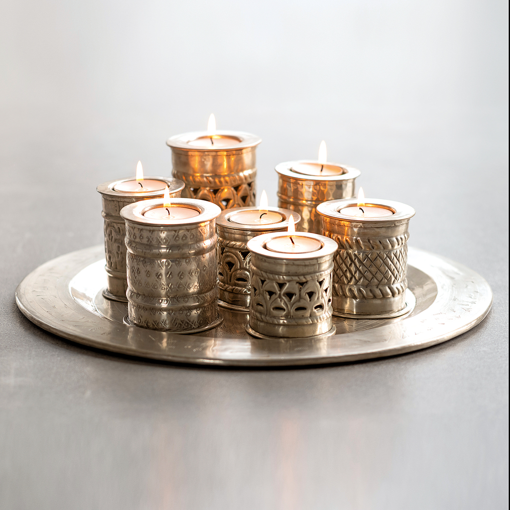 Orientalisches Flair und echten Glanz zugleich verbreiten diese sieben zylindrischen Kerzenleuchter auf einem runden Tablett mit arabeskenartigem Dekor: Die Leuchter sind unterschiedlich hoch und jeder ist mit einem anderen Dekor versehen – allen gemeinsam ist jedoch die Gestaltung nach Art der traditionellen Metallbearbeitung der Maghreb-Länder. Tablett und Leuchter sind aus Messing getrieben und poliert oder versilbert, so dass sie bei Sonnenlicht in hellem Glanz erstrahlen, bei Dunkelheit aber den rötlichen Schein der Kerzenflammen hell reflektieren. Jeder Kerzenleuchter verfügt über einen Einsatz für ein Teelicht.