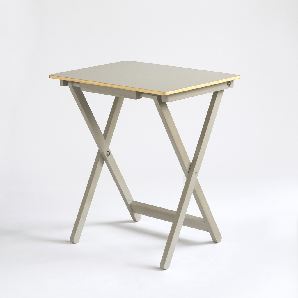 Kleiner, klappbarer Tisch, der sich als flexibel einsetzbarer Beistelltisch eignet. Bei Bedarf kann er sehr flach zusammengelegt werden. Vollständig hellgrau lackiert – die Kanten der 1 cm starken Tischplatte sind mit Blattgold vergoldet.
