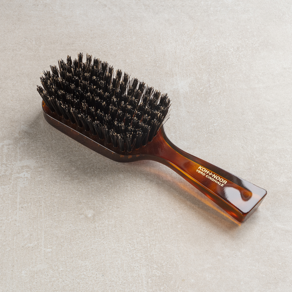 Handgefertigte Haarbürste von Koh-i-Noor aus der Lombardei: Wildschweinborsten eignen sich besonders für feines und kürzeres Haar, dem sie mit wenigen Strichen mehr Volumen und Struktur verleihen. Korpus aus hochwertigem, sehr sauber verarbeitetem Zelluloseacetat mit Hornanmutung. Koh-i-Noor stellt seit 1950 Haarbürsten von internationalem Ruf her. Rechteckige Bürste.