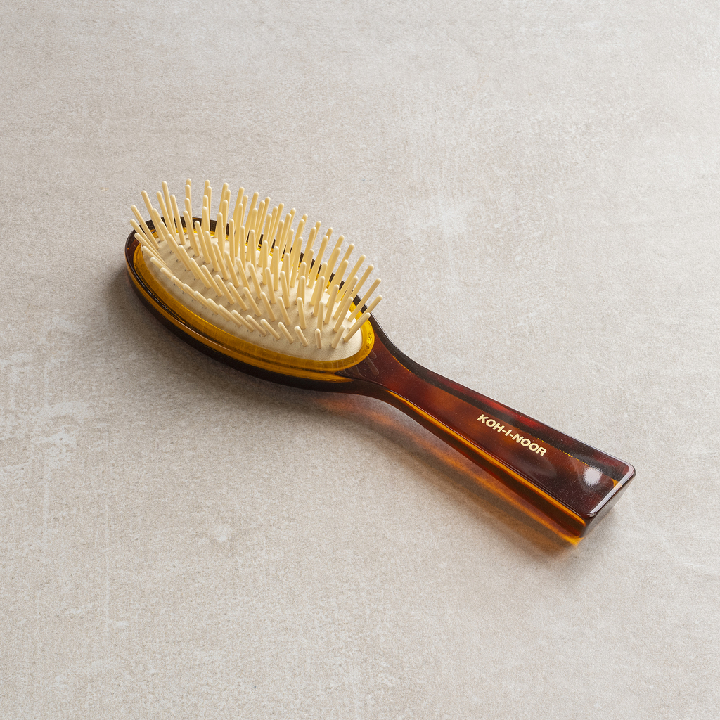 Handgefertigte Haarbürsten von Koh-i-Noor aus der Lombardei: Die luftgepolsterten Bürsten mit zylindrischen Kunststoffstiften eignen sich besonders für langes und lockiges Haar und löst Knötchen schonend. Korpus aus hochwertigem, sehr sauber verarbeitetem Zelluloseacetat mit Hornanmutung. Koh-i-Noor stellt seit 1950 Haarbürsten von internationalem Ruf her.