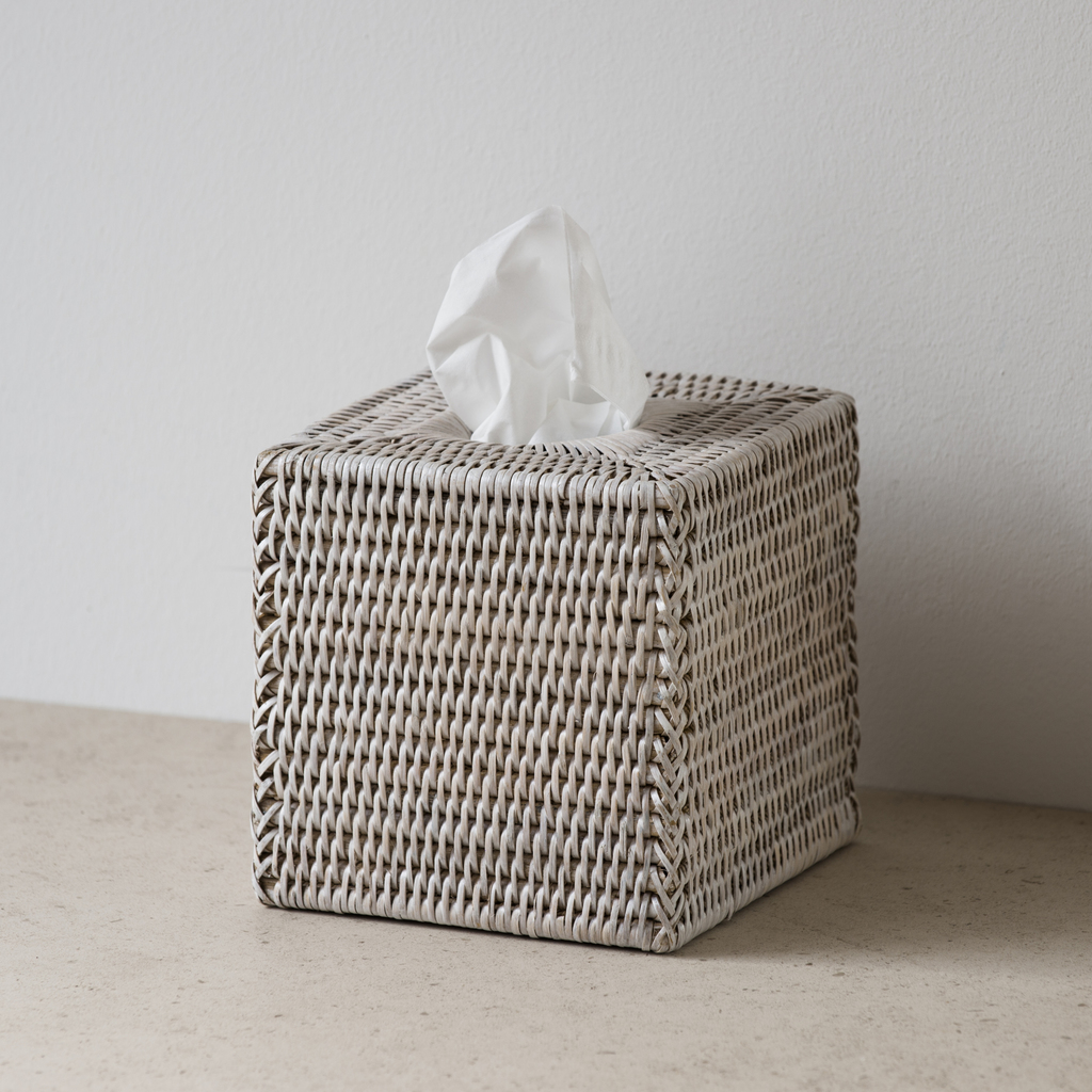 Quadratische Kleenexbox für das Badezimmer aus Rattangeflecht aus Birma. Die Rattanflechter Birmas haben die die wahrscheinlich längste Tradition und größte Erfahrung in diesem arbeitsintensiven Handwerk. Je enger und fester die Fasern geflochten werden, desto formstabiler ist das fertige Produkt, ohne dabei die für Rattan typische Flexibilität zu verlieren. Alle Rattanprodukte aus dieser Serie sind von Hand geflochten und mit einer wasserabweisenden Lasur versehen, die sie gegen die hohe Luftfeuchtigkeit in Badezimmern immun machen. Seitenlänge 14 cm.