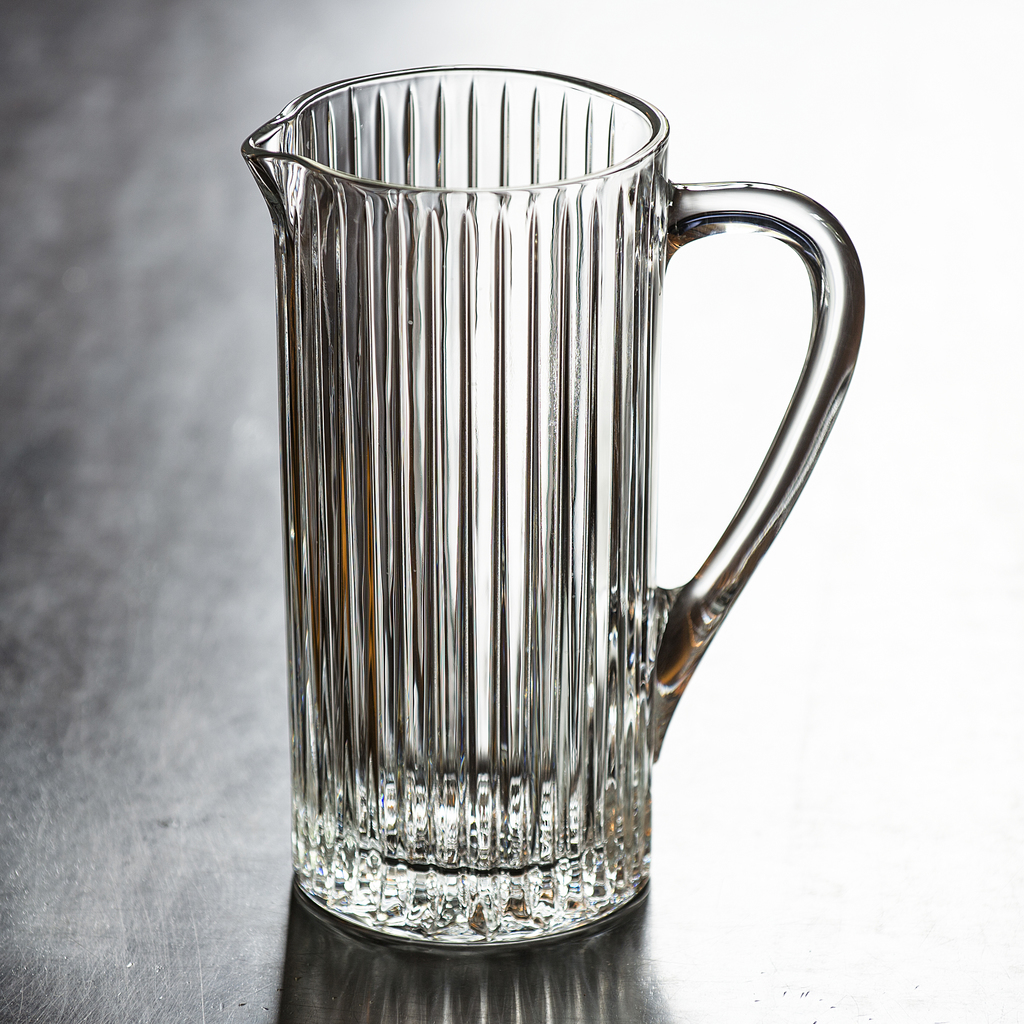 Krug mit Griff aus Kristallglas, der durch seine vertikalen Rillen sehr elegant wirkt. Aus einer traditionsreichen toskanischen Kristallmanufaktur in Colle Val d’Elsa zwischen Siena und Florenz.