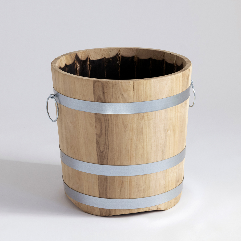 Diese unverwüstlichen Blumenkübel stammen aus einer ungarischen Küferei. Das verwendete Holz der Akazie (auch Robinie genannt) ist besonders witterungsbeständig und wird außer im Faßbau vor allem im Schiffsbau verwendet. Die Holzdauben werden 18 Monate im Freien abgelagert und später zur Konservierung innen ausgebrannt. Die Kübel stehen auf Füßen, um den Abfluß überschüssigen Wassers zu ermöglichen. Metallteile verzinkt.