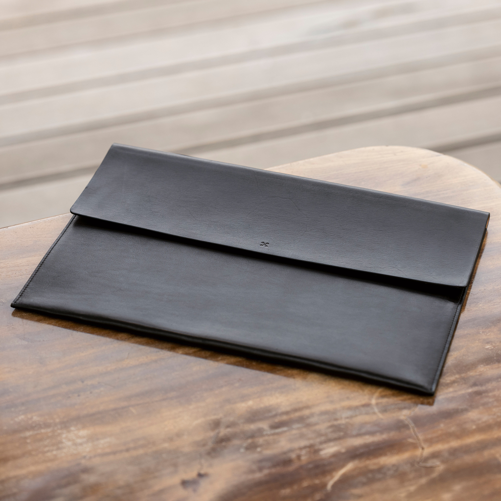 Ein Stück italienisches Rindleder, zwei robuste Nähte und eine Klappe mit verdeckten Magnetverschlüssen: Mehr braucht dieses puristische Briefcase nicht. Gefertigt aus pflanzlich gegerbtem Sattelleder, das nach dem Färben lediglich mit Lederfett behandelt wird und mit allen Spuren, die Gebrauch und Zeit hinterlassen, schön altern darf. Das mit feinem Futterleder ausgekleidete Innenfach nimmt Dokumente bis DIN A4 auf, aber auch einen Laptop bis 14 Zoll.