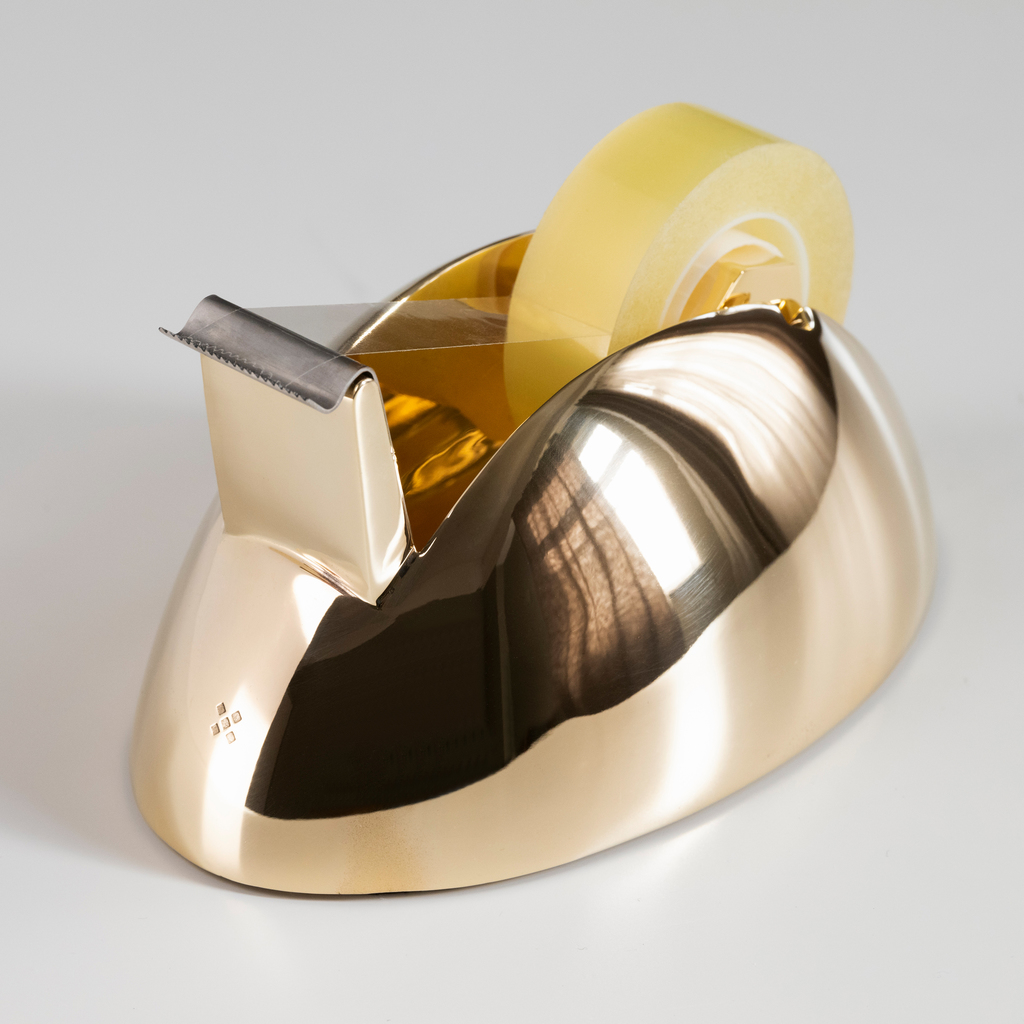 Ein Tape Dispenser, der das Zeug zur Designikone hat: Seine klare, wiedererkennbare Form wurde aus einem Ellipsoid entwickelt. Er wird in einer Sandform aus Messing gegossen, entgratet und hochglanzpoliert und ist stolze zwei Kilogramm schwer. Sein hohes Gewicht hat eine äußerst angenehme Nebenwirkung: Er bleibt unverrückbar stehen, wenn man am Klebeband zieht – und ist damit einer der wenigen Tischabroller, die man mit einer Hand bedienen kann, während die andere gerade das Geschenkpapier in Position hält.