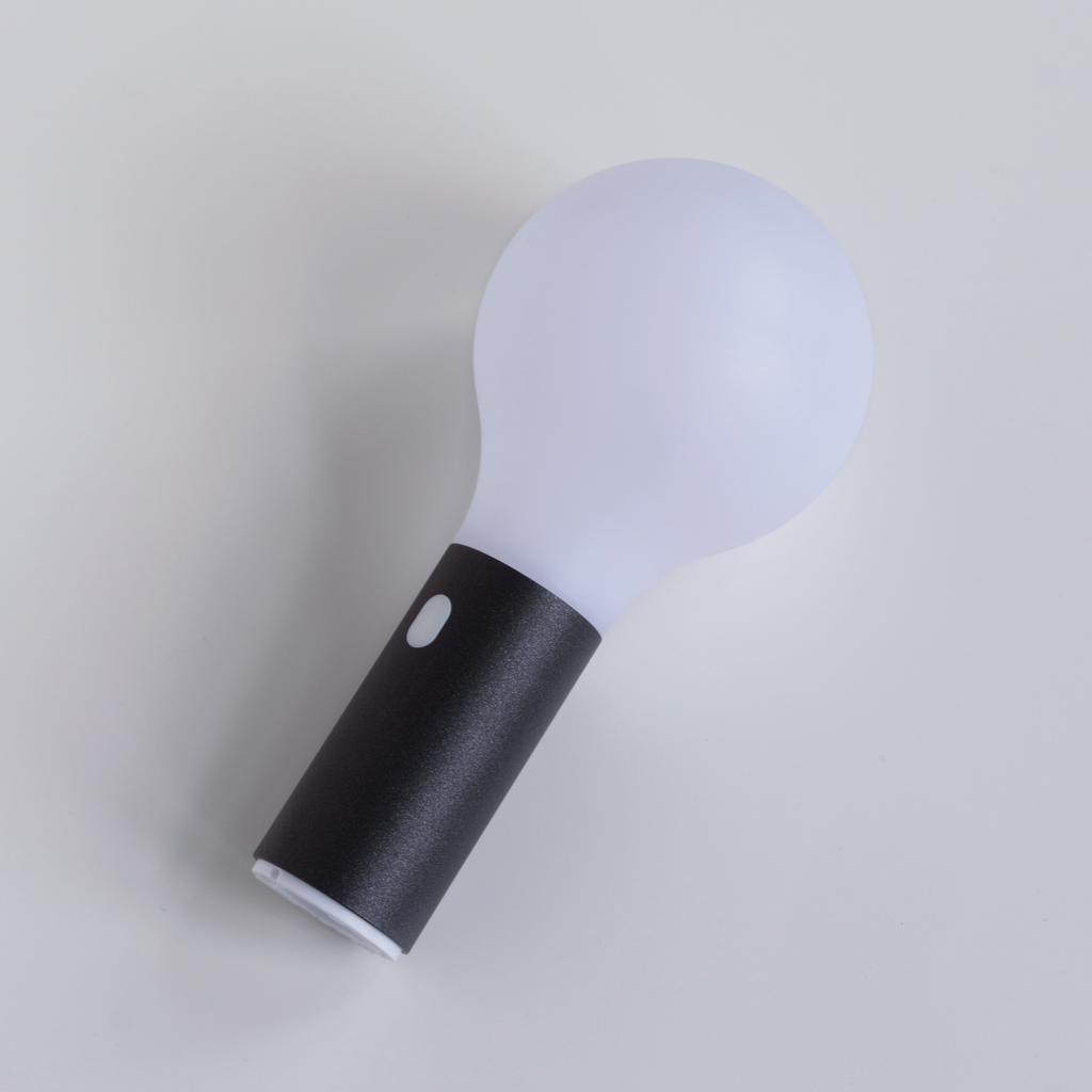 Diese in Form einer stilisierten Glühbirne gestaltete Akkuleuchte kann je nach Situation und Wunsch drinnen und draußen als Taschenlampe, Tischleuchte oder Hängeleuchte verwendet werden. Lichtleistung 70 Lumen, Farbtemperaturwahl zwischen warm- und kaltweiß (3000 K oder 6000 K, jeweils zweistufig dimmbar). Inklusive Leuchtmittel,0,5 Watt (nicht wechselbar) und Akku (wechselbar).