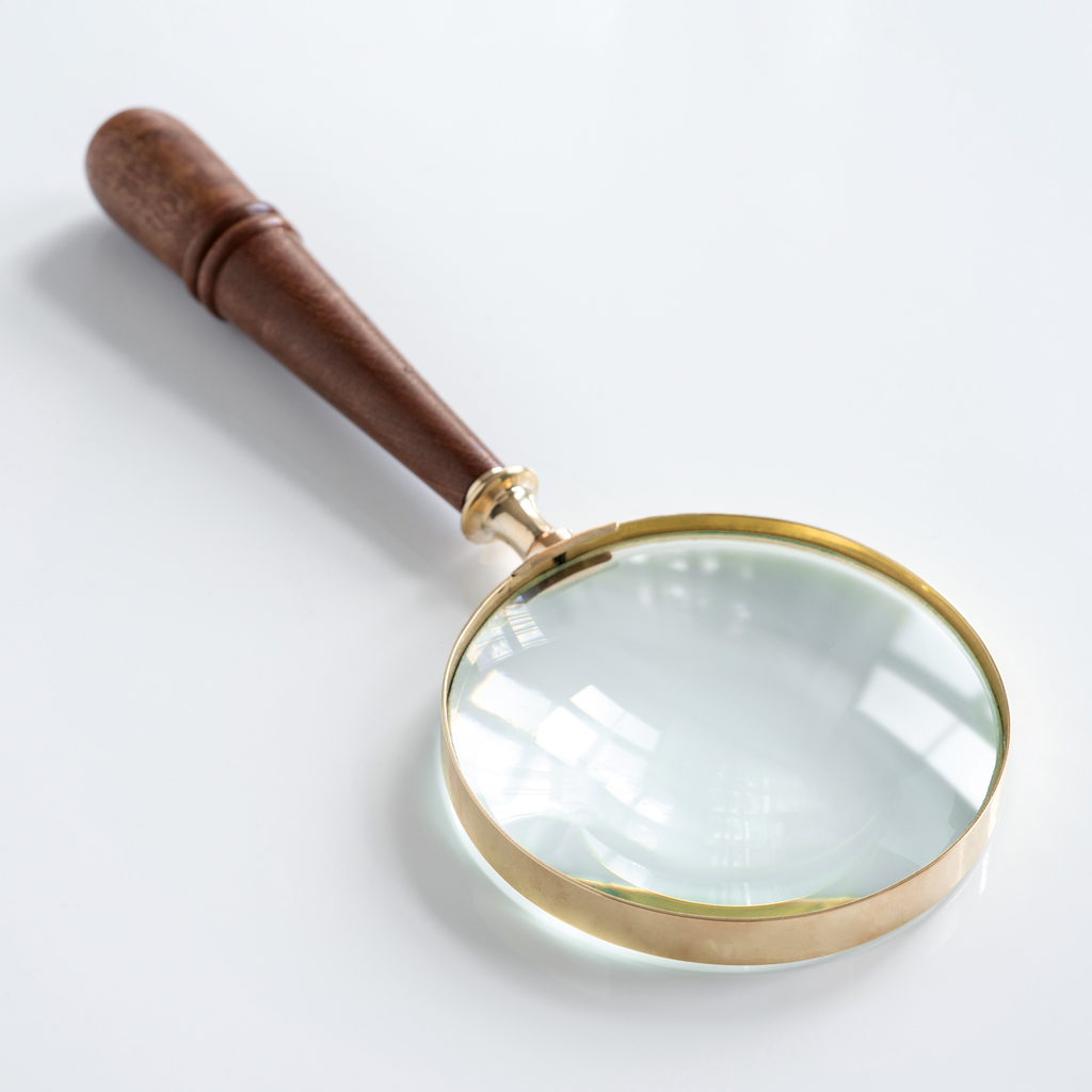 Nicht nur für Hercule Poirot, Meisterdetektiv aus zahlreichen Agatha Christie Romanen, ist eine Lupe ein nützliches Werkzeug zum Begutachten kniffliger Details. Diese elegante Handlupe mit einer Fassung aus poliertem Messing und gedrechseltem Holzgriff kann immer griffbereit auf dem Schreibtisch liegen, um winzige Bildunterschriften in der Zeitung zu entziffern oder Finessen auf Briefmarken und Münzen zu betrachten.