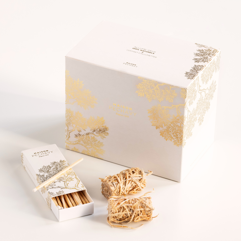 Dekorative Box mit umweltfreundlichen Kaminanzündern aus gerollter Holzwolle inklusive einer Schachtel langer Streichhölzer. Die Anzünder bestehen aus naturbelassenem Pappelholz und sind nur mit reinem Wachs getränkt. Beim Entzünden entwickeln sich keine unangenehmen oder gar gesundheitsschädlichen Gerüche. Zum Anfachen von Kamin, Holzkohlegrill oder Feuerschale wird ein Holzwolle-Röllchen zwischen dem Anmachholz platziert und entzündet. Hergestellt in Frankreich. 56 Anzünder und 35 Streichhölzer.