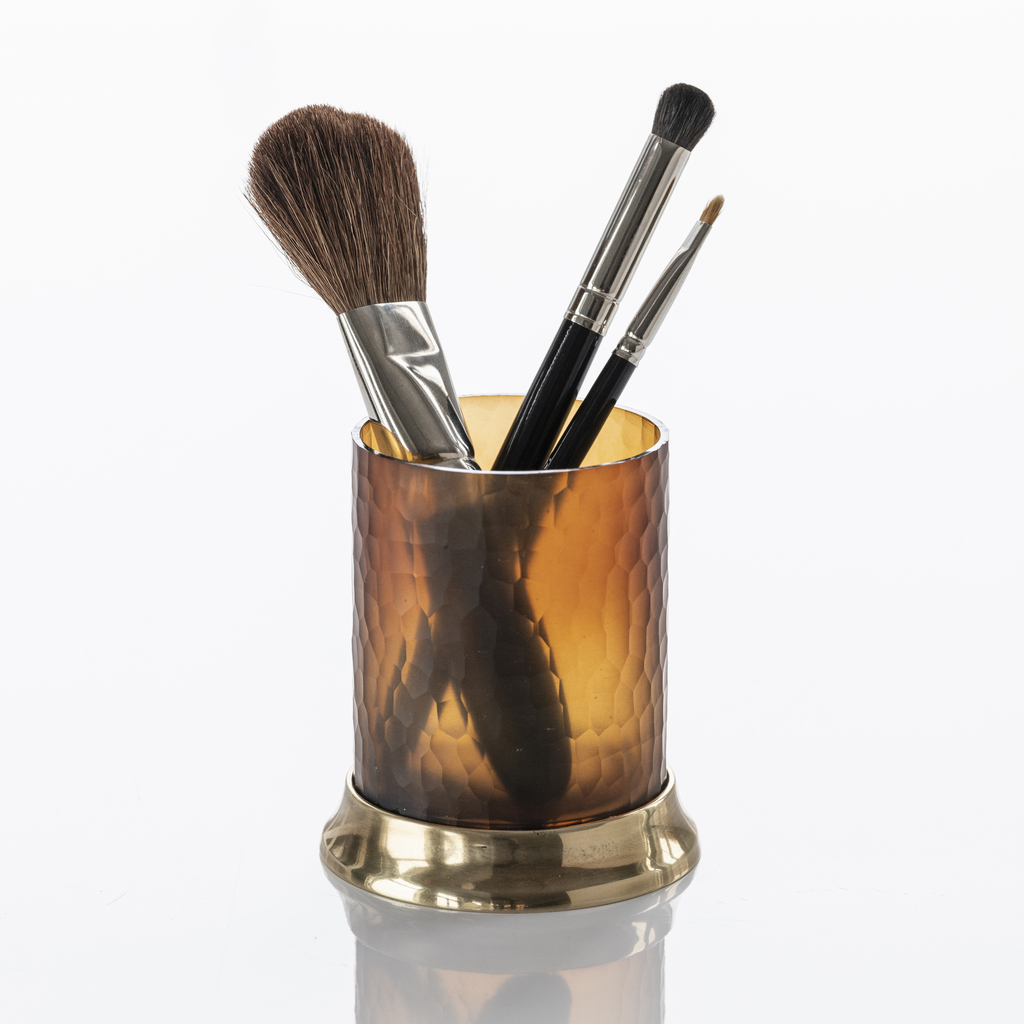 Zylindrischer Zahnputzbecher aus Glas mit Basis aus Messing.