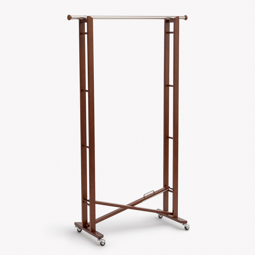 Wieder erhältlich: Nachdem unser früherer Hersteller das Modell aus dem Sortiment genommen hatte, legen wir diesen Kleiderständer mit seiner cleveren Faltmechanik nun selbst neu auf. Mit nur zwei Handgriffen verwandelt er sich: Einfach die Kreuzverstrebung am Griff auseinander- oder zusammenschieben und die Garderobenstange ein- oder aushängen. Gefertigt aus massivem Buchenholz, überzeugt die stabile Garderobe nicht nur als flexible Lösung bei vielen Gästen, sondern auch im Dauereinsatz. Zusammengeklappt misst sie lediglich 11 cm in der Breite und lässt sich bequem verstauen. Mit leichtlaufenden, kugelgelagerten Rollen. Garderobenstange aus poliertem Edelstahl, Länge 105 cm. Lässt sich in wenigen Schritten zusammenbauen.