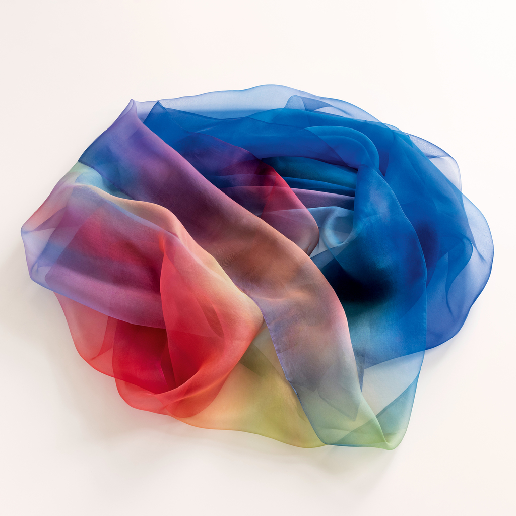 Diese überlangen Schals sind echte Schmuckstücke und stammen aus dem Atelier der japanischen Textilkünstlerin Naoe Kawamura. Es sind durchweg Unikate und vollständig von Hand gefertigt. Feinstes Organza-Gewebe aus reiner Seide wird in einem Verfahren, das sich an die traditionelle japanische Färbetechnik des Yuzen anlehnt, schicht- und abschnittsweise eingefärbt, sodass fantasievolle Muster entstehen. Das Besondere ist, dass die Farben sich überlagern, als würden sie sich freifließend miteinander vermischen. Die Tiefe und Brillanz, die Naoe Kawamura dabei erreicht, sind absolut beeindruckend – wir haben tatsächlich noch nie auch nur annähernd Vergleichbares gesehen. Im Zusammenspiel mit der hauchfeinen, nahezu völlig transparenten Organza-Seide ergibt sich daraus ein sphärischer, nahezu unwirklicher Eindruck.