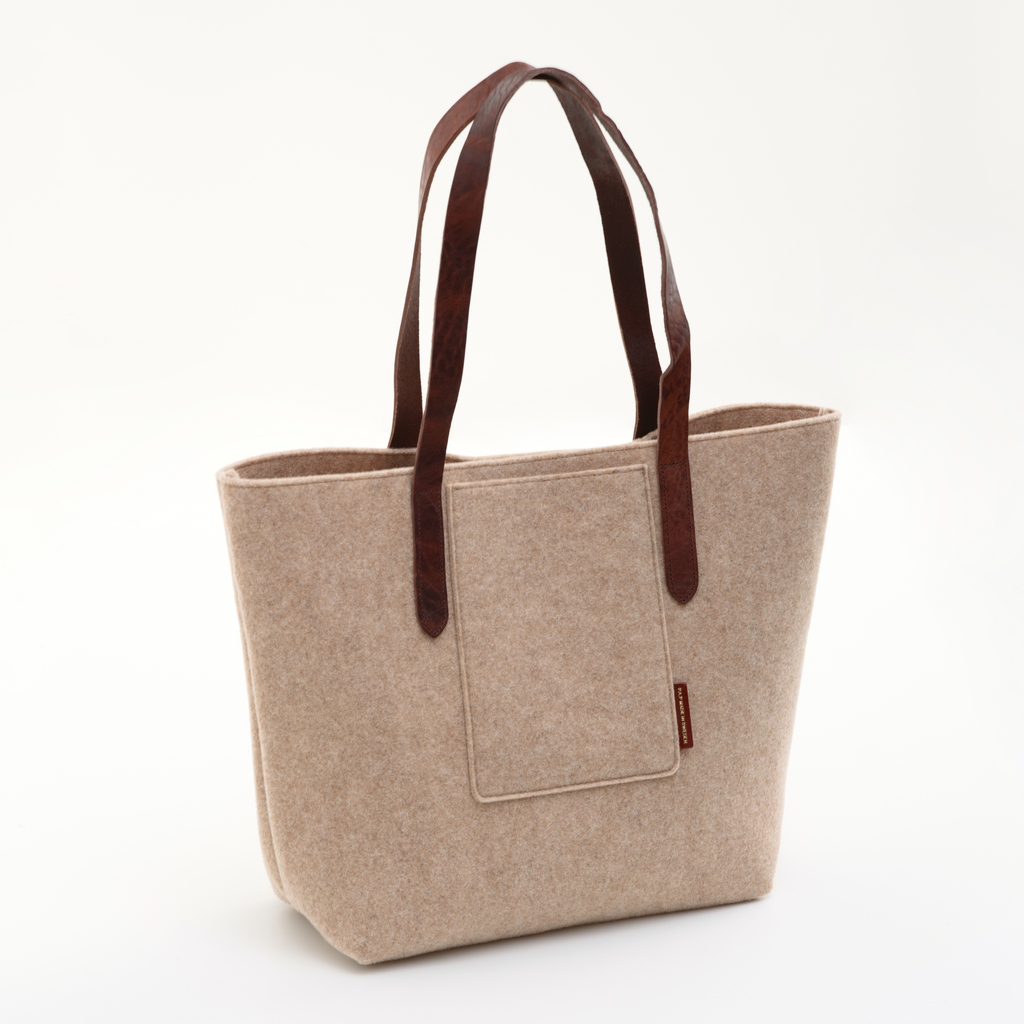 Überraschend leichte, geräumige Tasche aus formstabilem Filz, mit langen Henkeln aus pflanzlich gegerbtem dunkelbraunem Leder. Der Filz aus Wolle und einem kleinen, stabilisierenden Anteil aus recyceltem PET-Kunststoff erlaubt die minimalistische Verarbeitung der Tasche mit sichtbaren Nähten im Innern, da die Kanten nicht aufribbeln können. Ihr Einsatzgebiet ist vielfältig: Als Shopper oder große Handtasche für jeden Tag, in der Laptop, Lunchbox und Trinkflasche Platz haben. In das kleine Außensteckfach passt zusätzlich ein Smartphone oder DIN-A6-Tablet.