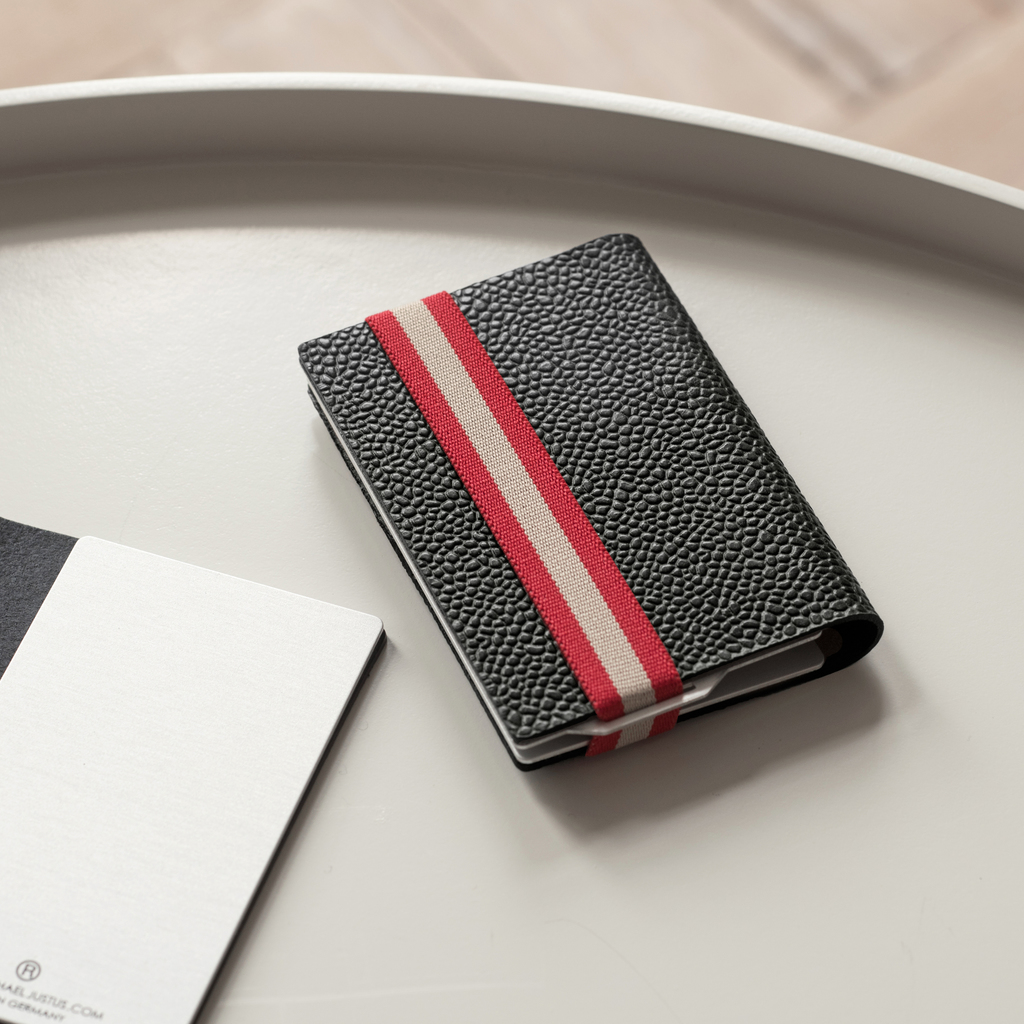 Das Q7 Wallet fasst bis zu 15 Karten sowie Visitenkarten, gefaltete Geldscheine oder Quittungen. Zwei Platten aus Aluminium, Bezug aus pflanzlich gegerbtem vollnarbigem Leder mit Scotchgrain-Prägung aus Italien. Als Verschluss dient ein elastisches Textilband.
