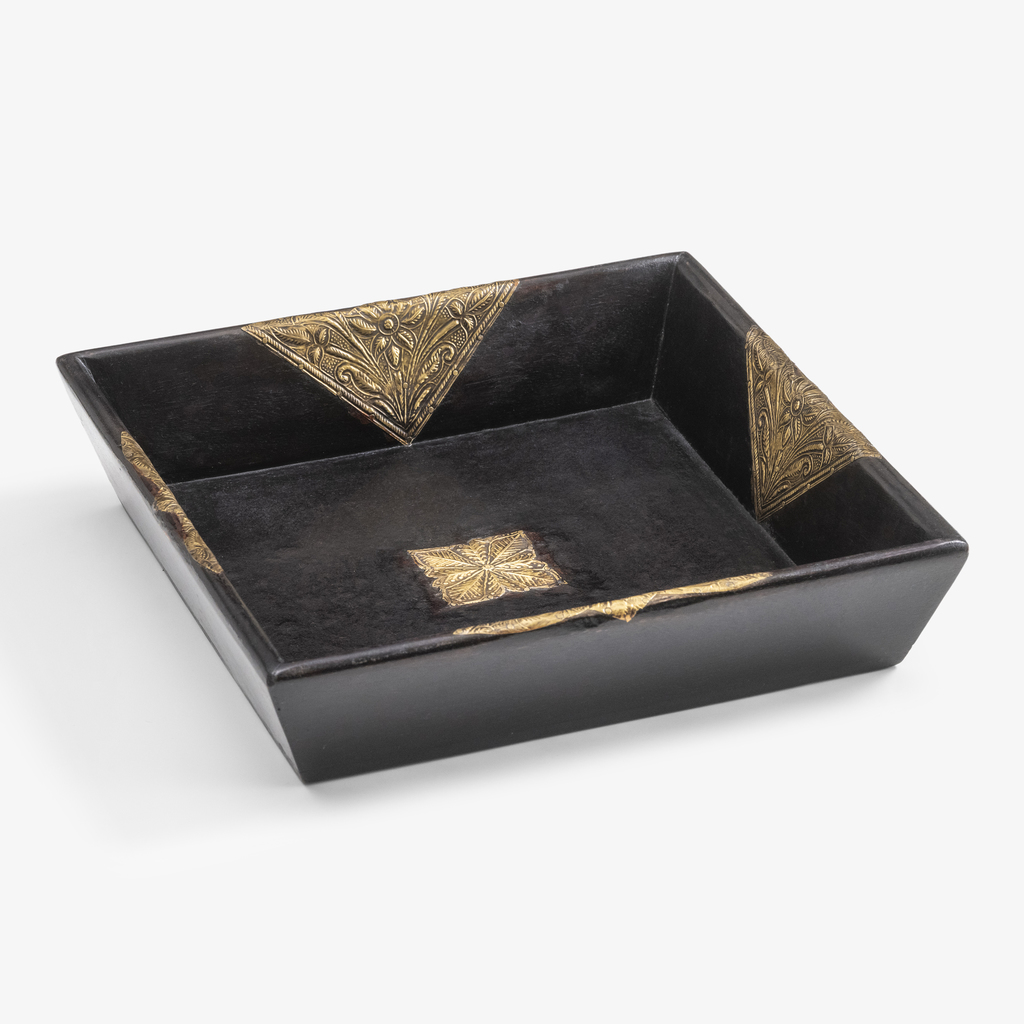 Diese quadratische Schale aus dunkel lackiertem Holz ist als präsentes, dekoratives Objekt konzipiert. Der tiefbraune, seidenmatte Ton des Holzes bildet einen ruhigen Hintergrund für die warm glänzenden Zierelemente aus Messing. Fein geprägte florale Ornamente sind als dreieckige Applikationen in den Ecken sowie als zentrales Quadrat in die Oberfläche eingelegt.